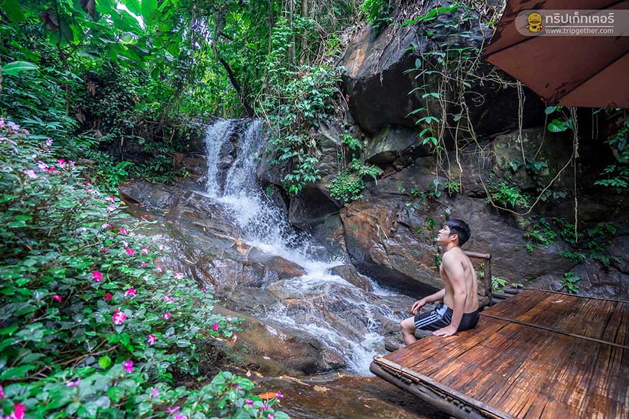 บริเวณพื้นที่ด้านหน้าห้องพักยังมีในส่วนของระเบียงส่วนตัวให้นั่งชมวิวธรรมชาติพร้อมฟังเสียงน้ำตกแบบเพลินๆ มุมนี้ลองหาหนังสือเล่มโปรดและกาแฟรสชาติดีๆ มาจิบสักแก้วรับรองว่าสโลว์ไลฟ์สุดๆ หรือจะสั่งหมูกระทะของทางที่พักมากินก็ฟินไม่แพ้กัน