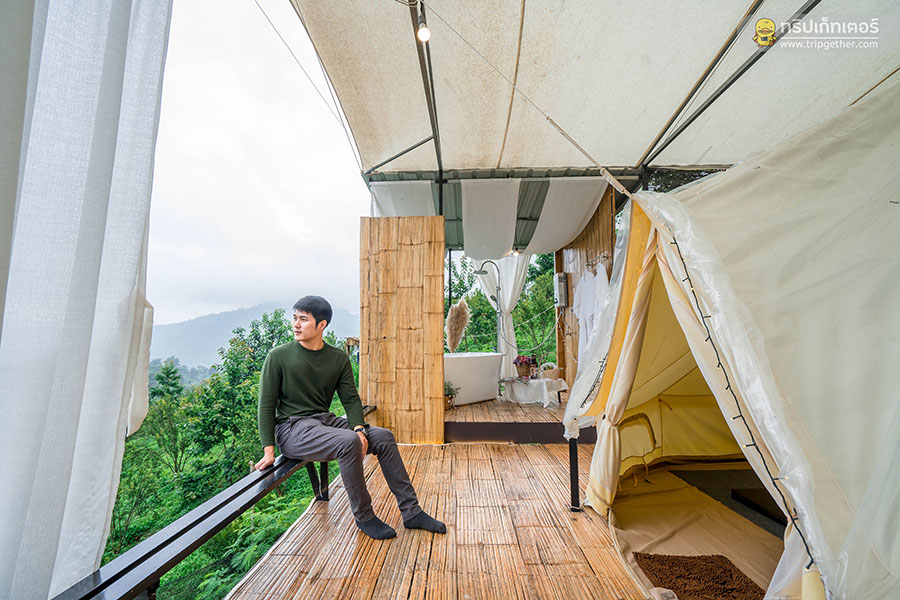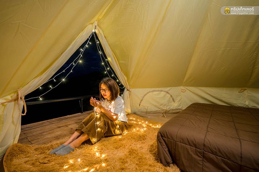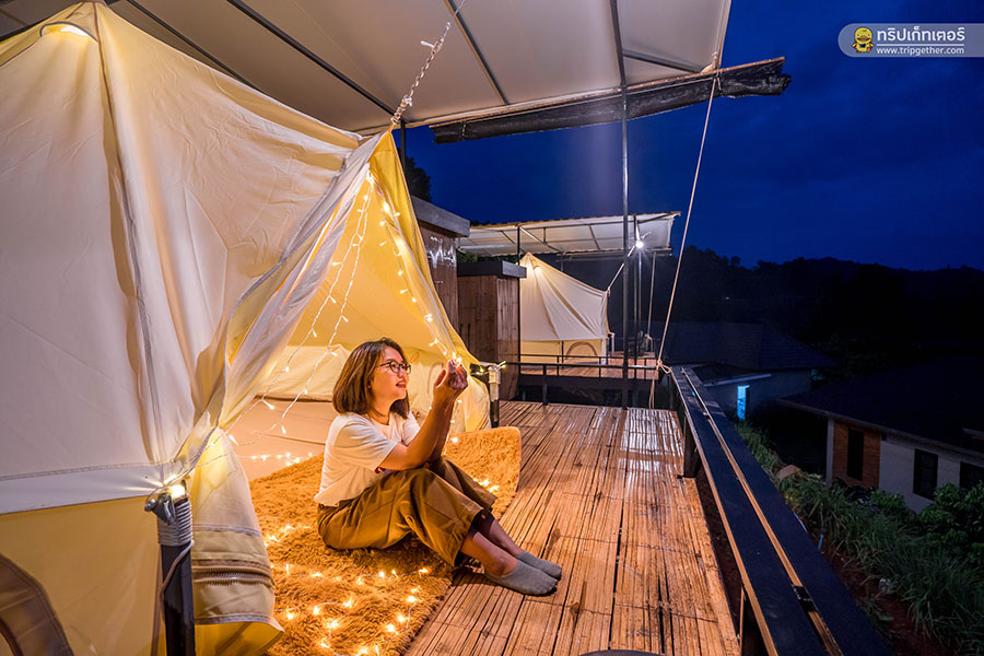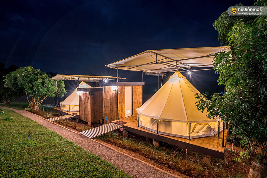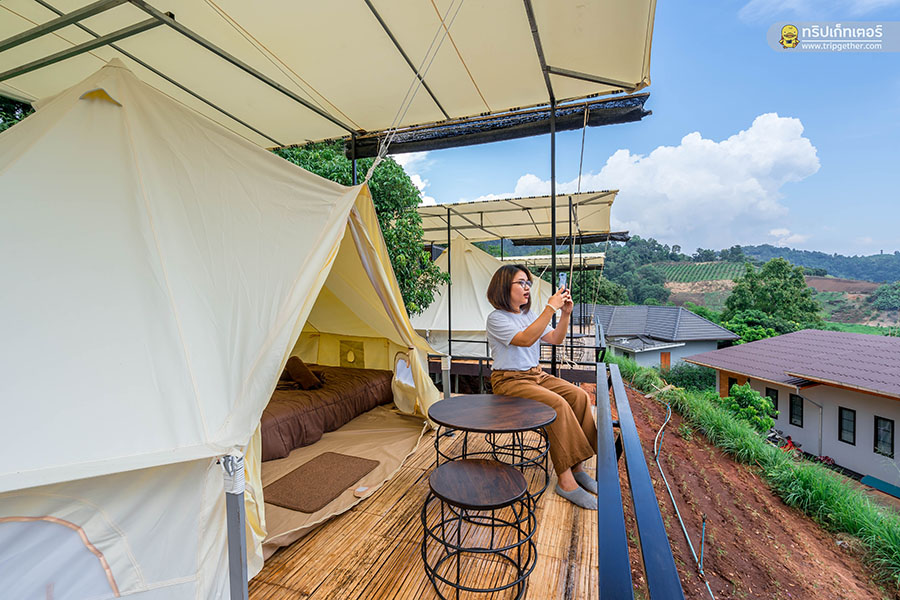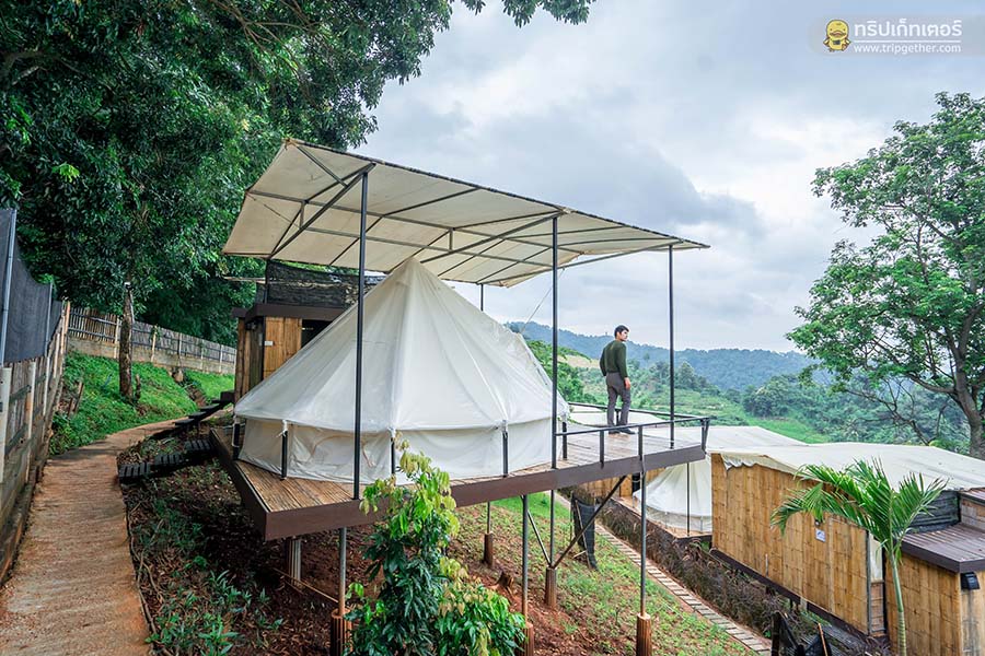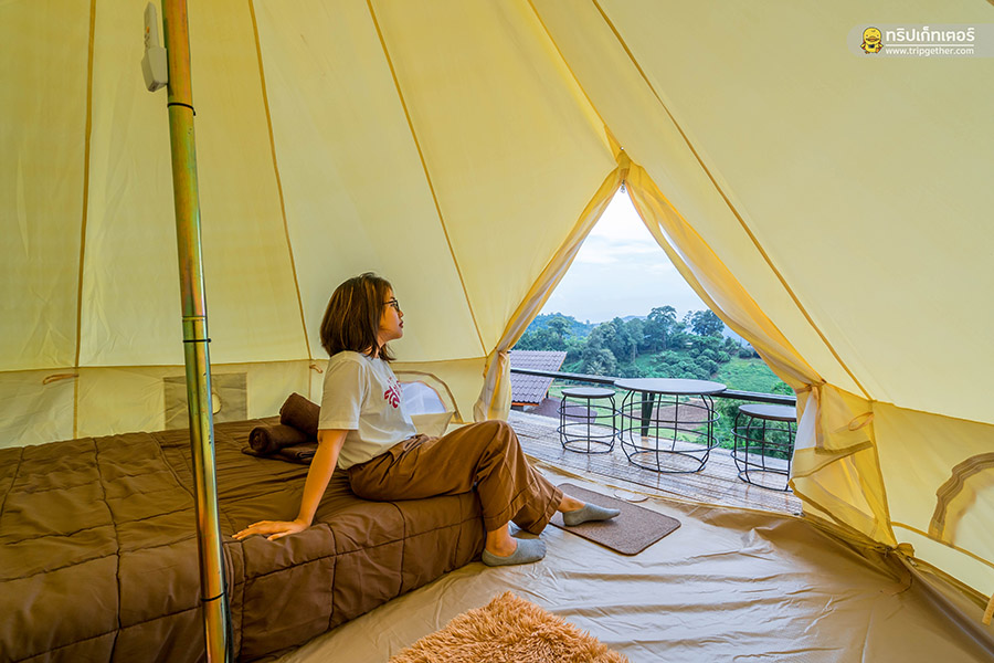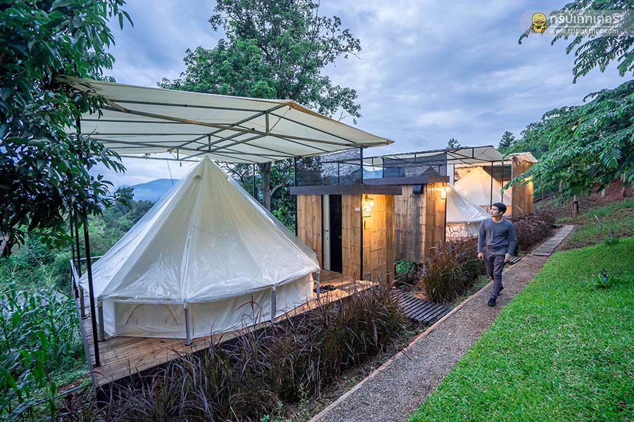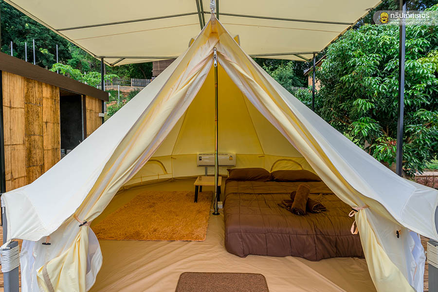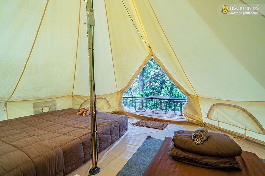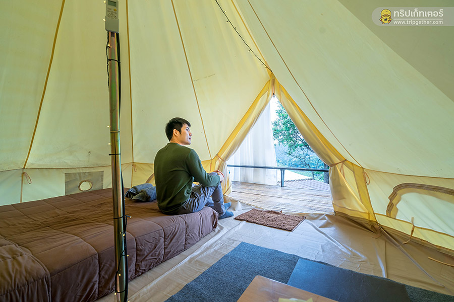 มาต่อกันที่ เต็นท์กระโจมติดแอร์ VIP ซึ่งจะแบ่งเป็นสองโซนคือโซนด้านบนและโซนด้านล่างแต่ทั้งสองโซนถูกออกแบบให้หันหน้าออกสู่วิวภูเขาทุกหลัง ตัวเต็นท์ยังใช้เต็นท์กันน้ำคุณภาพดีมาพร้อมกับหลังคาผ้าใบที่ช่วยกันฝนและความร้อนอีกชั้นเพื่อความสะดวกสบายแก่ผู้เข้าพัก