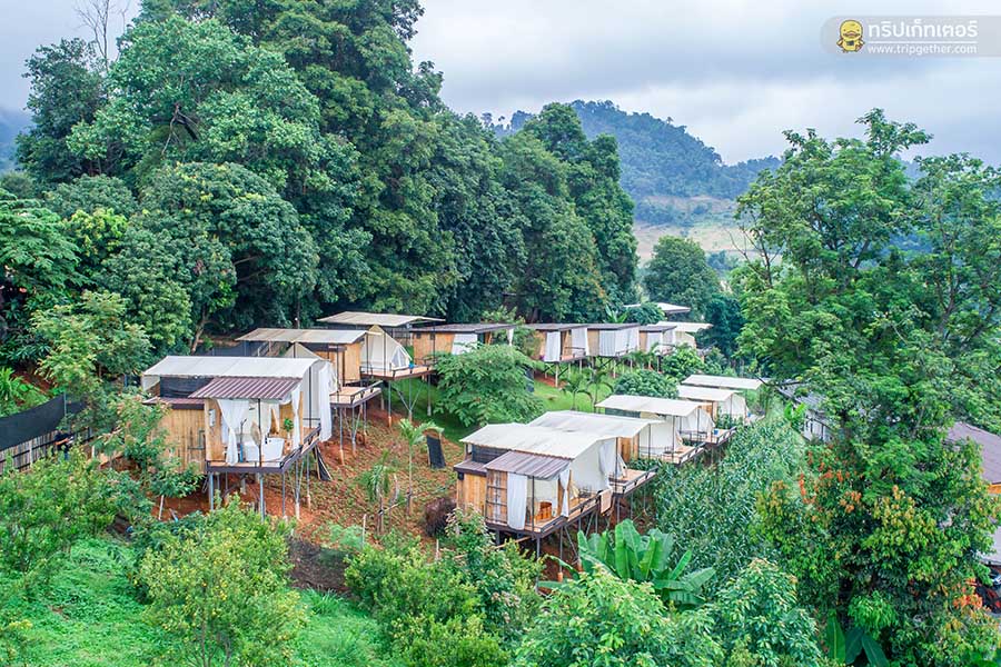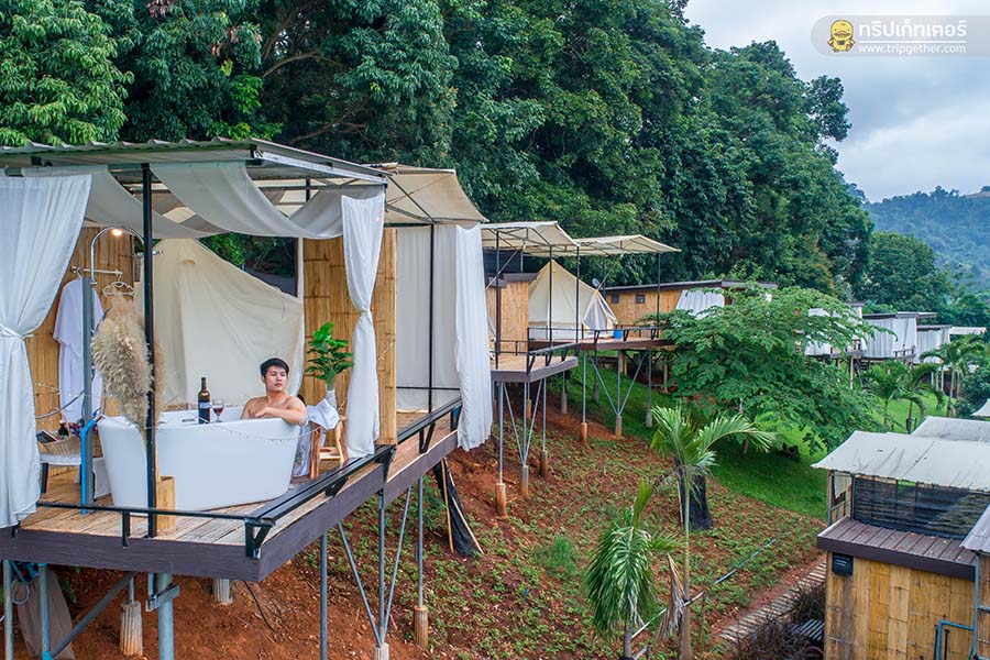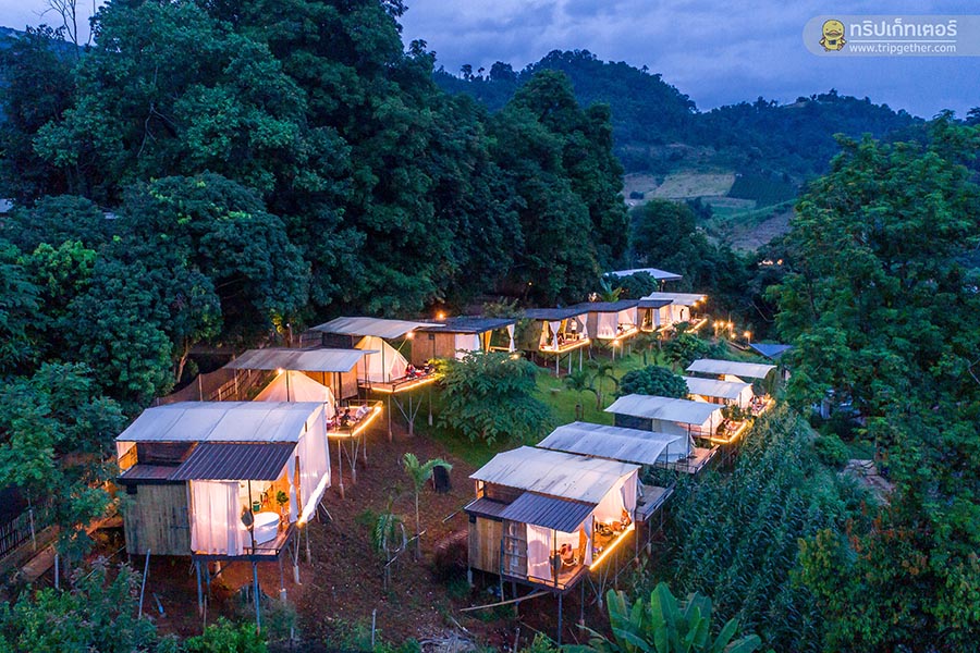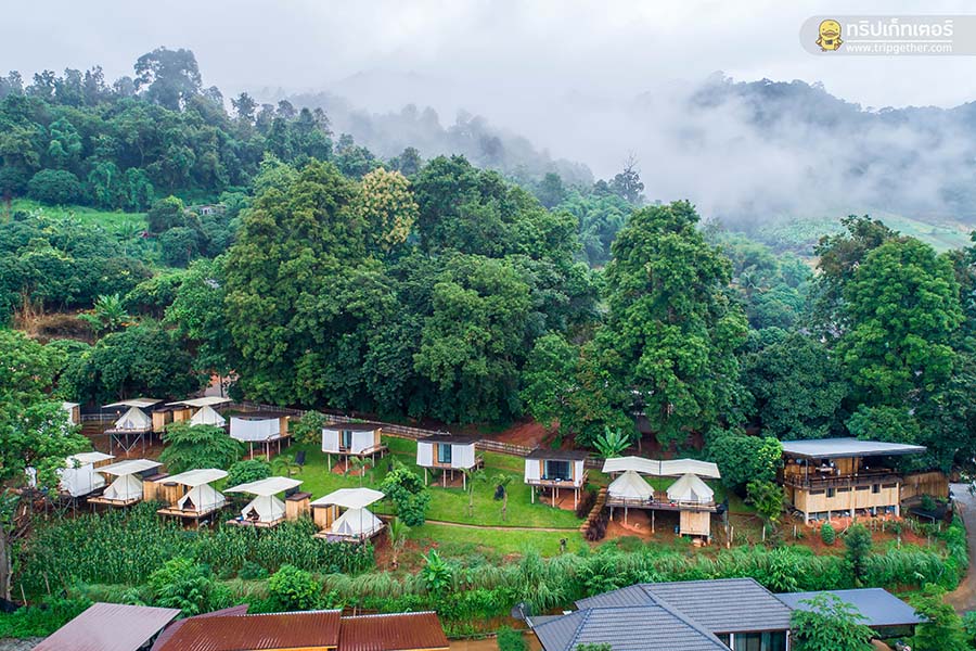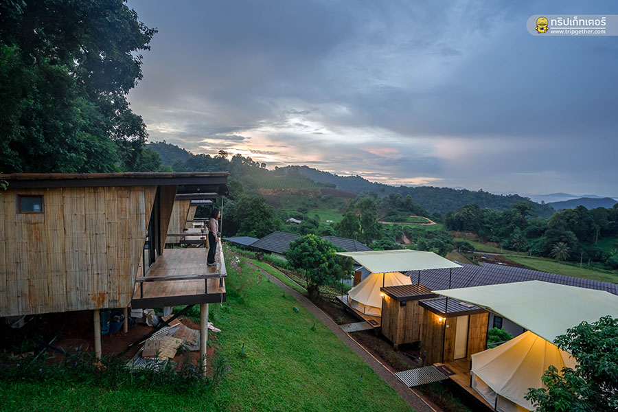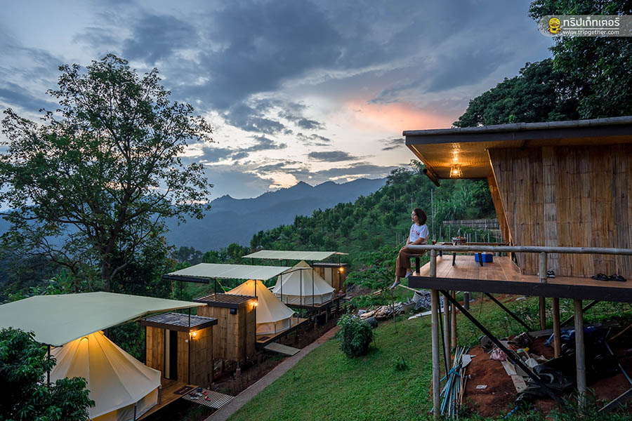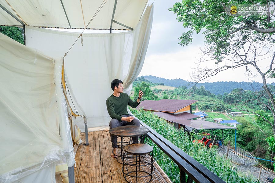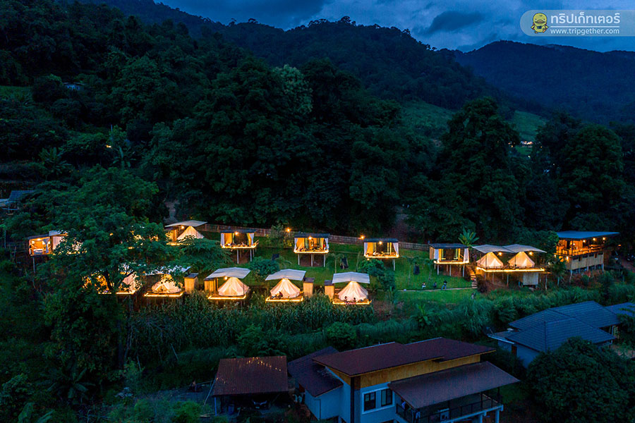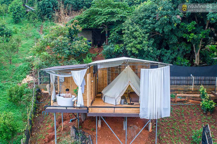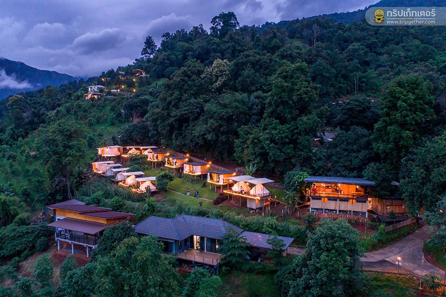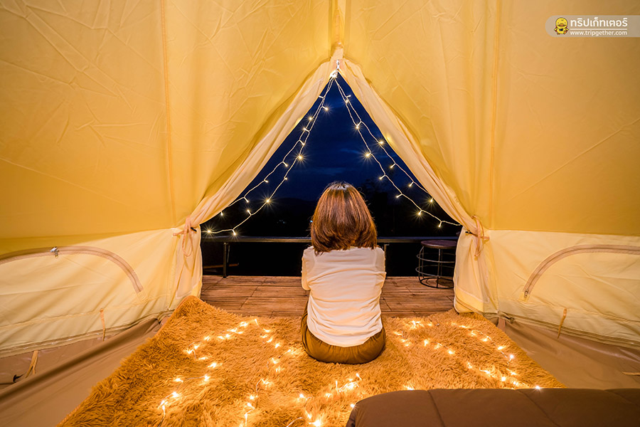 มาต่อกันที่ เต็นท์กระโจมติดแอร์ VIP ซึ่งจะแบ่งเป็นสองโซนคือโซนด้านบนและโซนด้านล่างแต่ทั้งสองโซนถูกออกแบบให้หันหน้าออกสู่วิวภูเขาทุกหลัง ตัวเต็นท์ยังใช้เต็นท์กันน้ำคุณภาพดีมาพร้อมกับหลังคาผ้าใบที่ช่วยกันฝนและความร้อนอีกชั้นเพื่อความสะดวกสบายแก่ผู้เข้าพัก