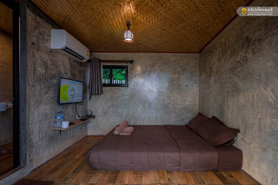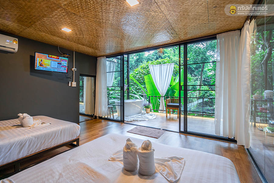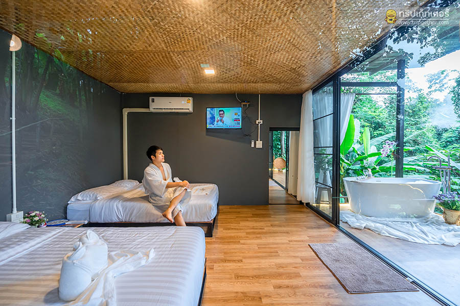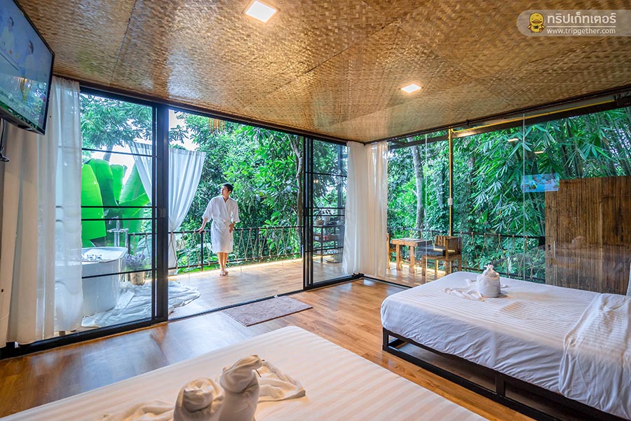 ภายในห้องพักตกแต่งได้อย่างมีสไตล์ โดดเด่นด้วยผนังกระจกบานใหญ่ทั้งด้านหน้าและด้านข้าง เพิ่มความใกล้ชิดธรรมชาติและสามารถนอนดูวิวต้นไม้น้อยใหญ่ได้จากบนเตียง และครบครันไปด้วยสิ่งอำนวยความสะดวกไม่ว่าจะเป็น เครื่องปรับอากาศ แอลซีดีทีวี และพัดลม