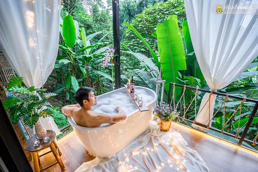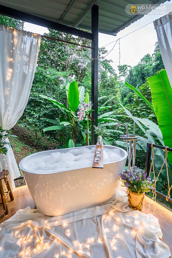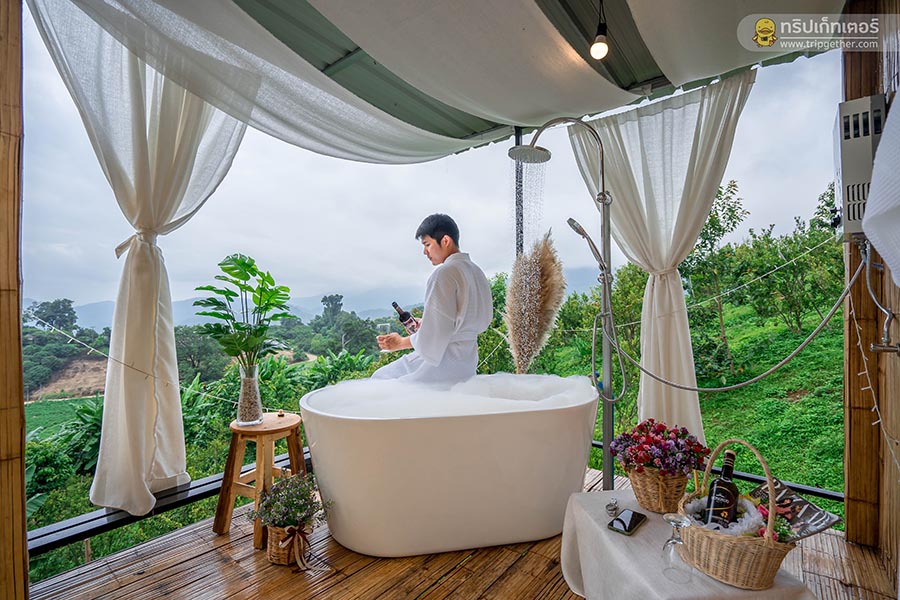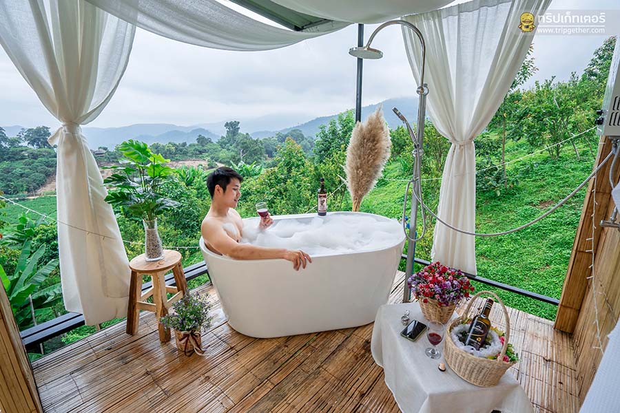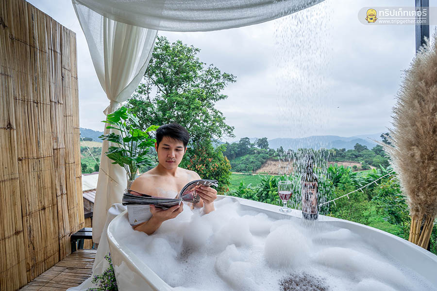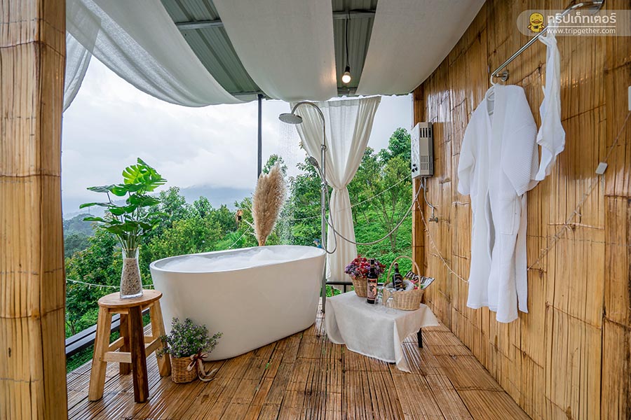 แต่ที่พิเศษสุดๆ เลยก็คือ พื้นที่เทอเรสขนาดพอเหมาะที่หันหน้าออกสู่วิวภูเขามาพร้อม อ่างอาบน้ำ แบบเอ้าท์ดอร์ที่สะดวกสบายด้วยระบบน้ำร้อน-เย็น ให้นอนแช่น้ำชมวิวกันแบบชิลล์ๆ และเพิ่มความฟินด้วย บาธบอมบ์ฟองสบู่สีขาวฟรุ้งฟริ้งซึ่งทางที่พักมีให้บริการราคา 200 บาท มุมนี้รับรองว่าถูกใจสายถ่ายรูปอย่างแน่นอน
