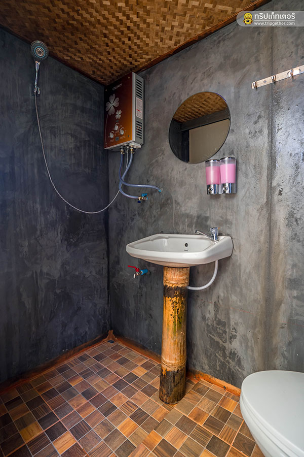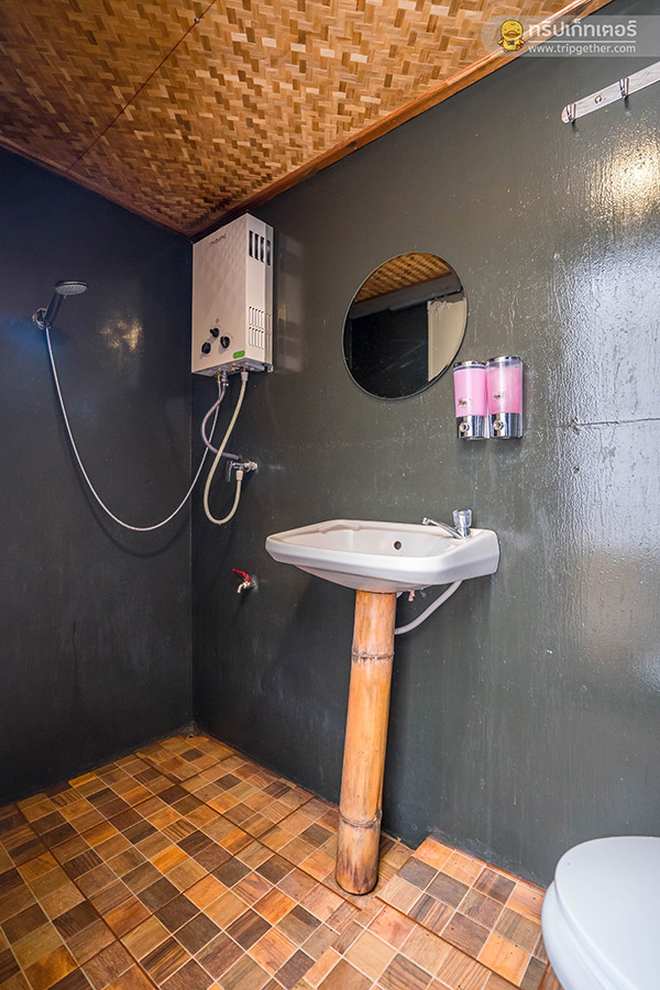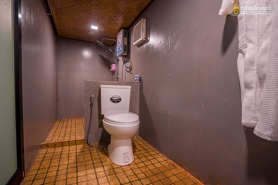สำหรับห้องน้ำก็สะอาดสะอ้าน ตกแต่งด้วยกระเบื้องสีน้ำตาลเข้ากับตัวห้องนอน และเซ็ตสุขภัณฑ์สีขาวเพิ่มความเรียบหรู พร้อมเครื่องทำน้ำอุ่นระบบแก๊สให้อาบน้ำกันแบบไม่ต้องกลัวหนาว แถมในห้องน้ำยังมีครีมอาบน้ำและแชมพูไว้ให้อีกด้วย