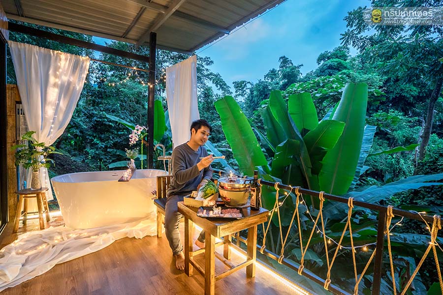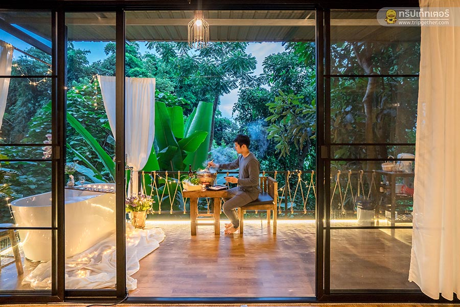 ไฮไลท์ของ บ้านริมธาร คงหนีไม่พ้น อ่างอาบน้ำ แบบเอ้าท์ดอร์ที่ตั้งอยู่ริมระเบียงที่มาพร้อมพร็อพตกแต่งและระบบน้ำร้อน-เย็น มุมนี้นอกจากจะถ่ายรูปสวยแล้ว ยังตอบโจทย์สไตล์การพักผ่อนของคนรุ่นใหม่ได้อย่างดีเยี่ยม