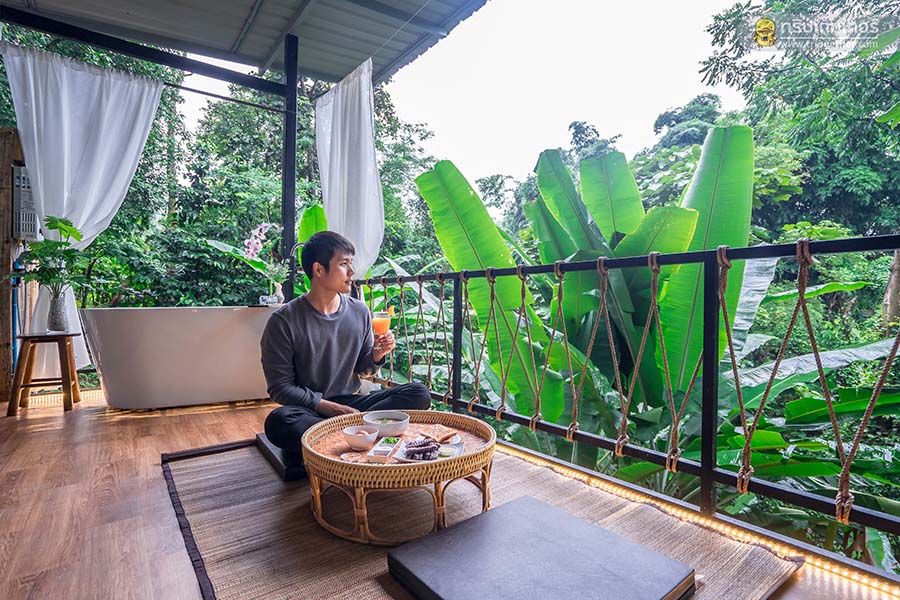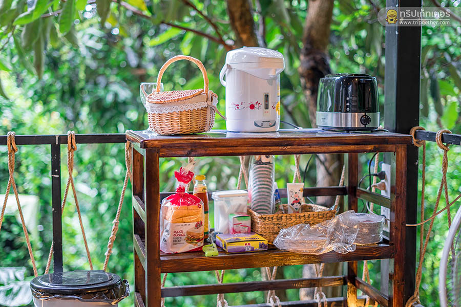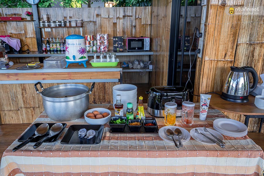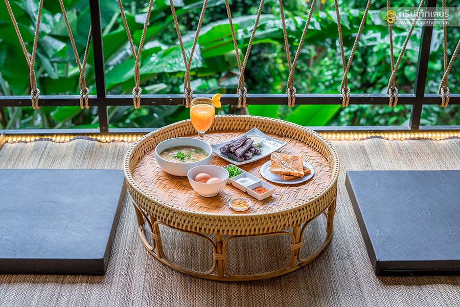 ความพิเศษของ บ้านริมธาร คือในตอนเช้าไม่ต้องขึ้นไปกินอาหารเช้าที่โซนอาหารด้านบน เพราะทางที่พักเสิร์ฟ ข้าวต้มหมู และไข่ลวก ให้ถึงหน้าห้องพัก แถมยังมีมุมกาแฟและขนมปังปิ้งไว้ให้ที่ระเบียงอีกด้วย