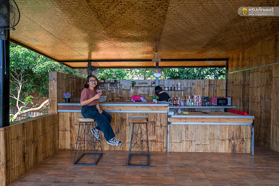 ที่โซนหน้าเต็นท์เป็นส่วนของระเบียงสำหรับทำกิจกรรมร่วมกันหรือจะสั่งหมูกระทะมากินหน้าเต็นท์ทางที่พักก็มีให้บริการ