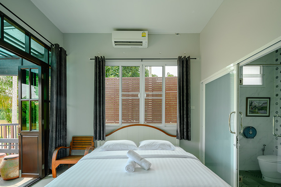 สำหรับใครอยากมานอนริมน้ำแบบใกล้ชิด ต้องมานอนที่ห้องนี้เลย เป็นห้องนอนริมน้ำสำหรับ 2 คน ที่แยกออกมาจากบ้านหลังใหญ่ แถมระเบียงอยู่ติดกับริมน้ำ มีเก้าอี้หน้าห้องให้ได้มานั่งรับลมสบายๆ
