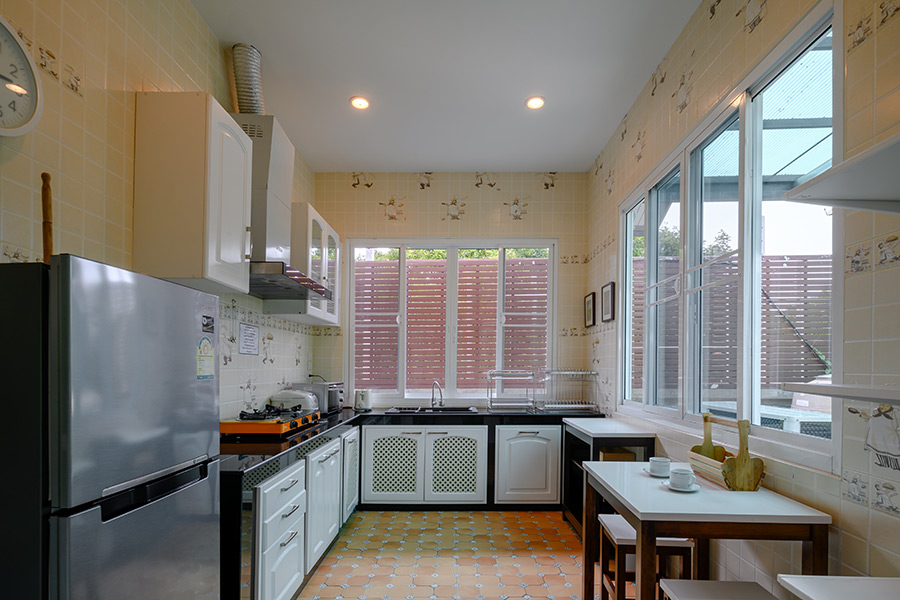 ห้องครัวที่มีอุปกรณ์ครบครัน ทั้งตู้เย็น เตาแก๊ส ไมโครเวฟ กาต้มน้ำร้อน จานชาม และเครื่องทำครัวอื่นๆ ตอบโจทย์สำหรับใครที่อยากจัดปาร์ตี้กับแก๊งค์เพื่อน ไม่ว่าจะทำบาร์บีคิว หรือทำอาหารกินเองก็สะดวกสบายมาก