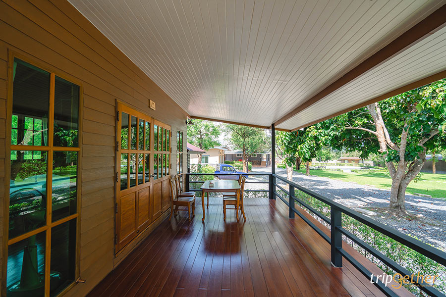 ในบ้านจัดสรรพื้นที่ได้อย่างลงตัว มีทั้งเตียงหลังใหญ่ เคาน์เตอร์บาร์เล็กๆ ตู้เย็น แอร์ นอกจากนี้เมื่อเปิดประตูออกมาก็มีระเบียงกว้างให้ได้นั่งชิลล์ เสพความกรีนฉ่ำๆ ในส่วนห้องน้ำเป็นห้องน้ำส่วนตัว แต่แยกออกมาจากตัวบ้าน