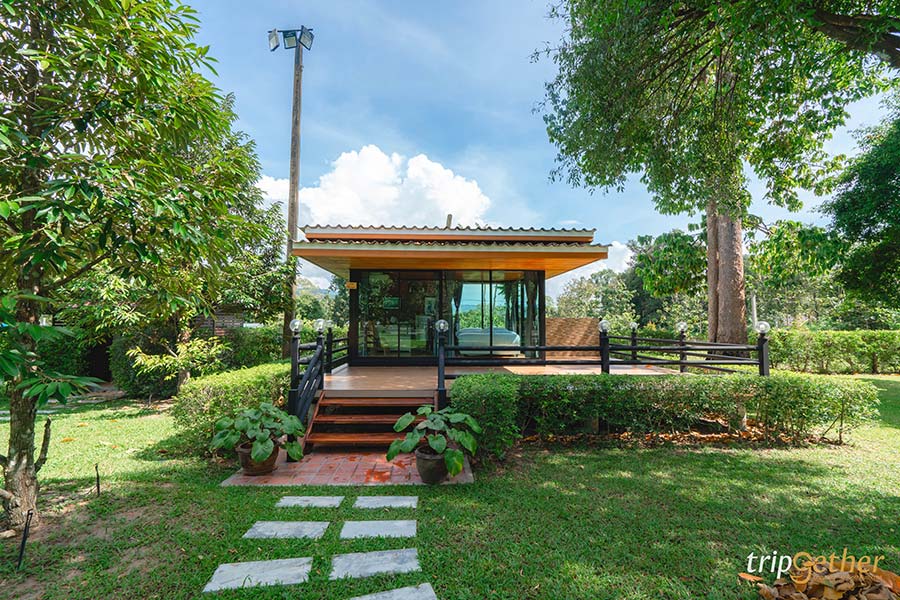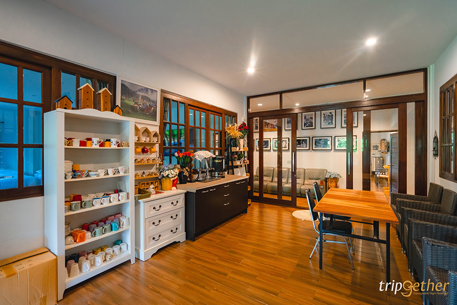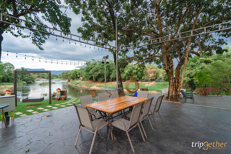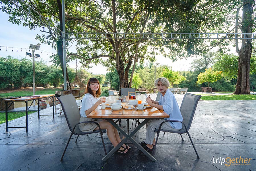 สุดท้ายเป็นห้องอาหารที่สามารถเลือกนั่งได้ทั้งแบบอินดอร์และเอาท์ดอร์ ถ้าอยากนั่งชิลล์ๆ ดื่มด่ำบรรยากาศก็แนะนำที่นั่งเอาท์ดอร์ ซึ่งเอาท์ดอร์ก็จะมีทั้งริมระเบียงและกลางสวน แต่แอบกระซิบว่าตอนเย็นต้องจัดปาร์ตี้กลางสวนสักหน่อย บรรยากาศดี ลมเย็นสบาย บวกกับการประดับประดาด้วยไฟต่างๆ เรียกได้ว่าฟีลดีสุดๆ แถมทางที่พักก็มีจัดเตรียมเซ็ทปิ้งย่างบาร์บีคิวไว้ให้พร้อม หรือถ้าใครอยากได้มื้อเย็นแบบจัดเต็มก็สามารถนำอาหารมาทำเองได้เลย โดยทางที่พักก็มีเตรียมอุปกรณ์ครัวไว้ให้หมด ไม่ว่าจะเป็นจาน ชาม ช้อน ส้อม เครื่องปรุง อุปกรณ์เครื่องครัวต่างๆ ยกเว้นเตาแก๊สที่ต้องเตรียมมาเอง