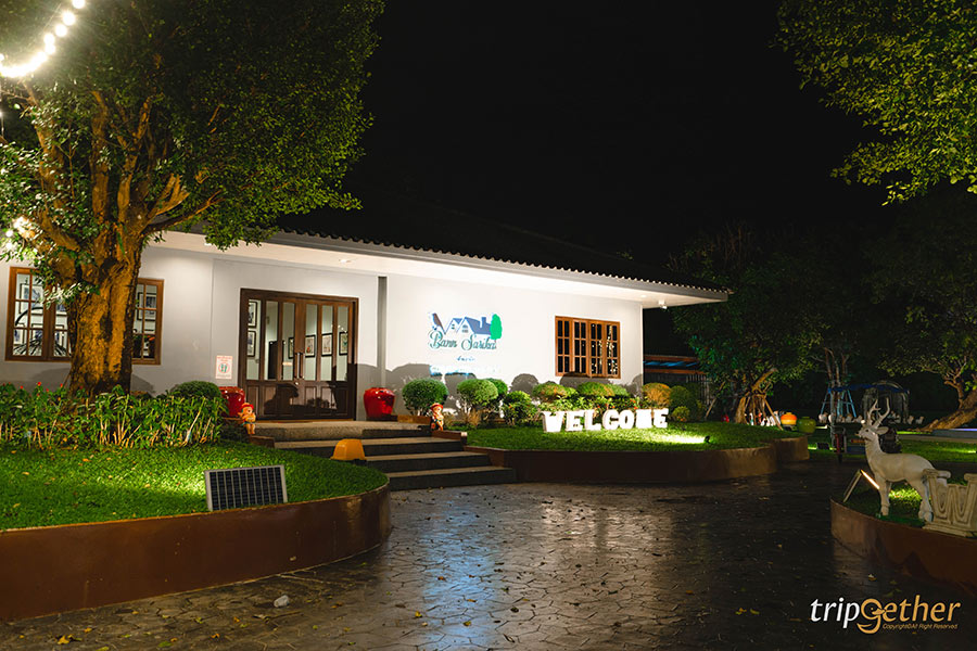 บรรยากาศยามค่ำคืนในที่พักดูสว่างไสวและอบอุ่นด้วยแสงไฟ
