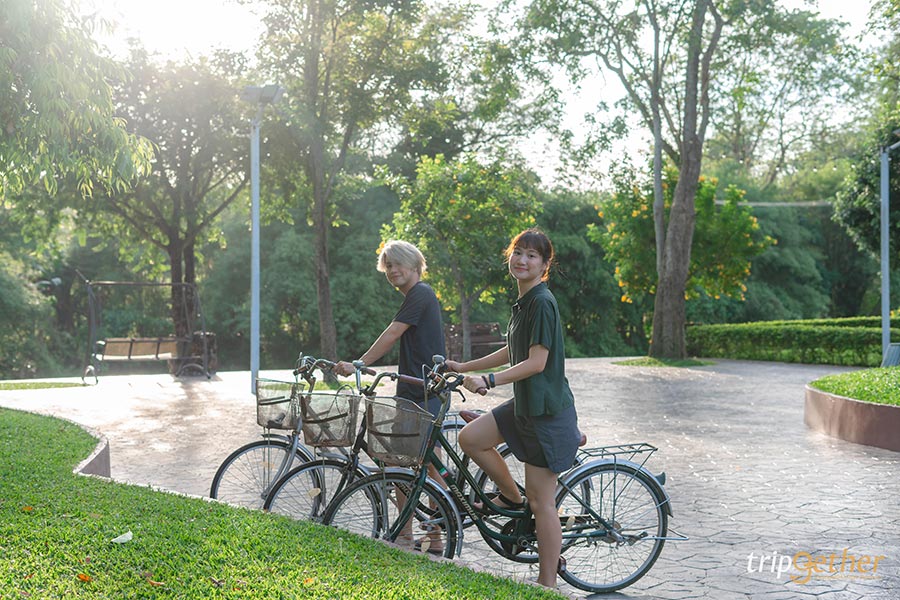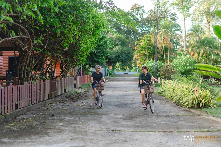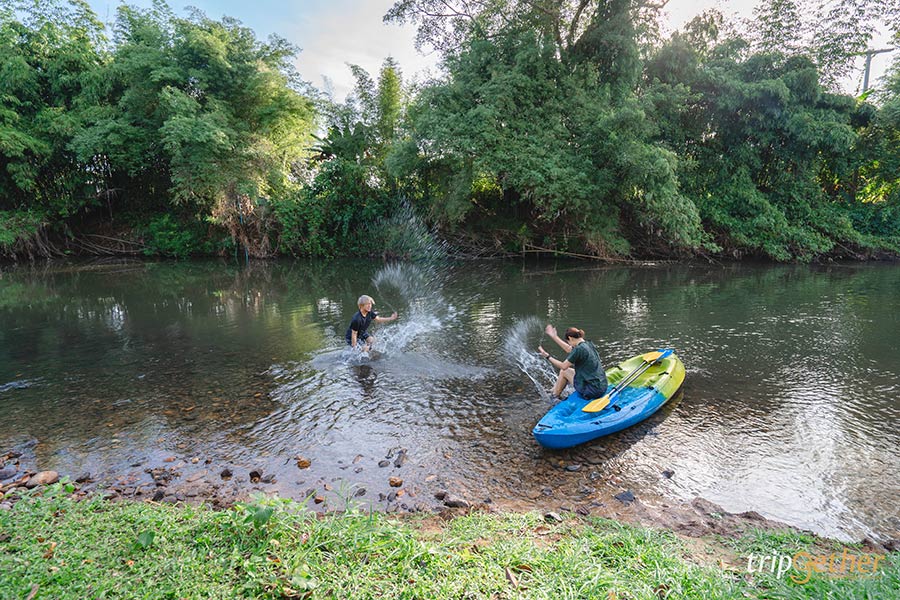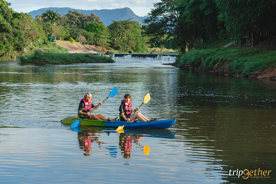 เมื่อเติมพลังเรียบร้อยก็มาเล่นกิจกรรมสนุกๆ กันต่อเลย โดยกิจกรรมภายในที่พัก เริ่มจากปั่นจักรยานยามเช้า เรียกเหงื่อยามเช้ากันเบาๆ ก่อนด้วยเส้นทางปั่นจักรยานรอบๆ หมู่บ้าน ช่วงเช้าที่อากาศกำลังเย็นสบาย ปั่นจักรยานชิลล์ๆ คือดีงามมาก นอกจากนี้ยังมีกิจกรรมทางน้ำอย่าง พายเรือคายัค เป็นกิจกรรมที่สนุกและสดชื่นสุดๆ เราสามารถพายเรือเข้าไปใกล้กับน้ำตก ได้เห็นน้ำตกแบบใกล้ชิดจริงๆ