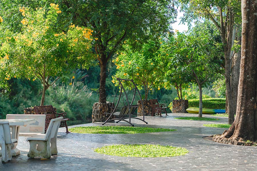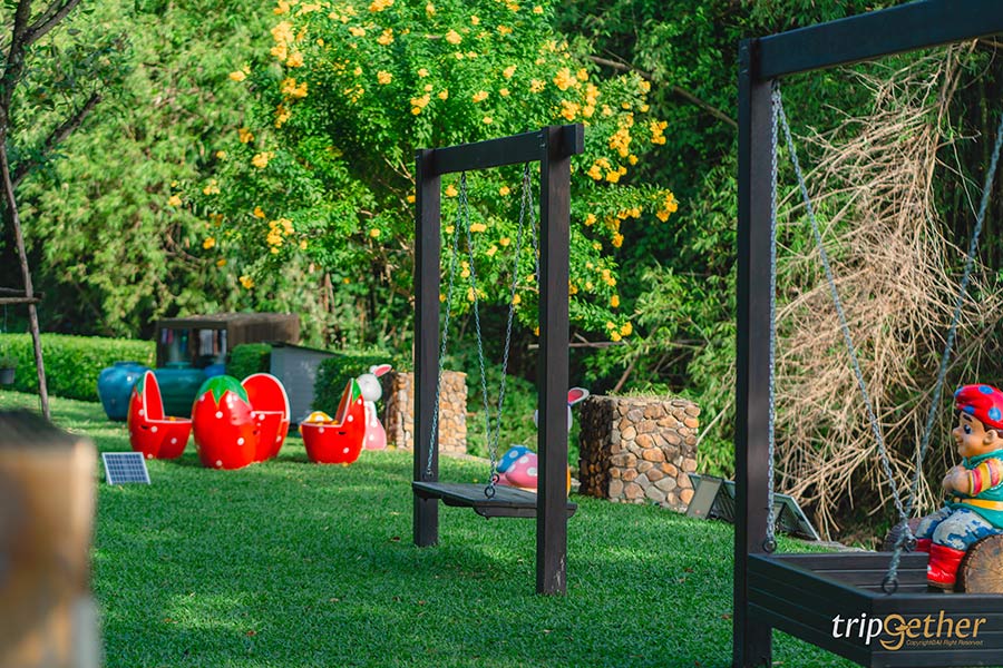 ในสวนมีพื้นที่สวนกว้าง บรรยากาศโล่งโปร่ง มีที่นั่งเล่นมองวิวลำธาร หรือจะนั่งชิลล์ๆ ใต้ร่มเงาไม้ก็ฟีลดี เหมือนให้ธรรมชาติบำบัด