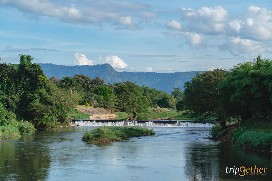 ฝายกั้นน้ำที่ไหลลงมาเป็นเหมือนน้ำตกกว้าง บวกกับมีฉากหลังเป็นแนวเขา บอกเลยว่าสวยมาก
