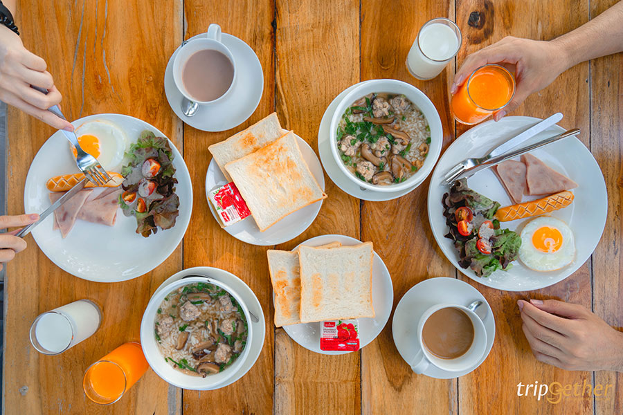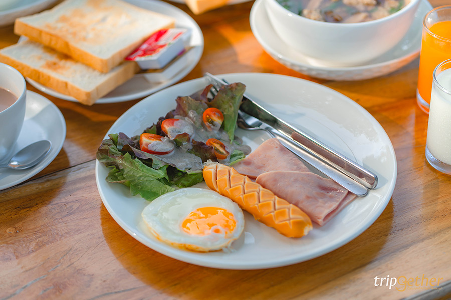 เต็มอิ่มกับมื้อเย็นแล้วก็มาต่อกันที่มื้อเช้า สำหรับมื้อเช้านี้ทางที่พักก็เตรียมอาหารไว้ให้แบบจัดเต็ม ทั้งข้าวต้ม เซ็ต American Breakfast กาแฟ โอวัลติน นม น้ำส้ม และขนมปัง แต่ถ้าใครมากันเป็นกลุ่มใหญ่ๆ ทางที่พักก็จะเปลี่ยนเป็นไลน์อาหารแบบบุฟเฟ่ต์แทน เรียกได้ว่าเป็นมื้อเช้าที่อิ่มแบบจุกๆ กันเลย ส่วนอาหารเช้าก็สามารถเริ่มกินได้ตั้งแต่เวลา 07.00 – 10.00 น.