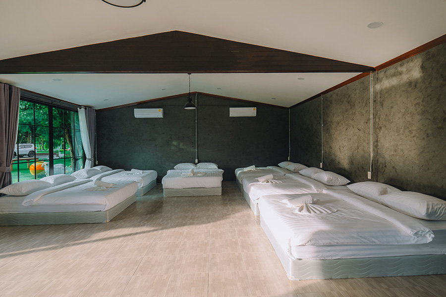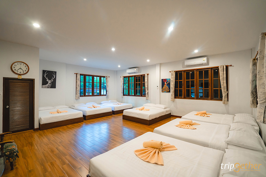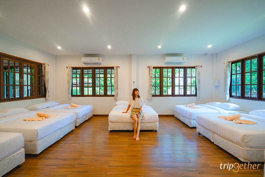 มาต่อกันที่ห้องนอนใหญ่ (Family Room) สำหรับ 12 -14 คน มีทั้งหมด 2 ห้อง มีห้องน้ำในตัว 1 ห้องและอีกห้องไม่มีห้องน้ำในตัว มาเริ่มที่มีห้องน้ำในตัวกันก่อน ในห้องมีพื้นที่กว้างมากมีเตียงทั้งหมด 7 หลัง เป็นห้องที่เหมาะกับกลุ่มเพื่อนที่อยากมาต่อปาร์ตี้หรือนั่งเล่นในห้อง เพราะมีพื้นที่กลางห้องให้ได้ทำกิจกรรมต่างๆ อีกทั้งในยังมีห้องน้ำส่วนตัว และสิ่งอำนวยความสะดวกต่างๆ บอกเลยว่าถ้าใครได้มานอนพักห้องนี้กับเพื่อน ให้เตรียมบอร์ดเกมและการ์ดเกมมาให้พร้อม รับรองว่าได้จอยกันยาวๆ ถึงเช้า