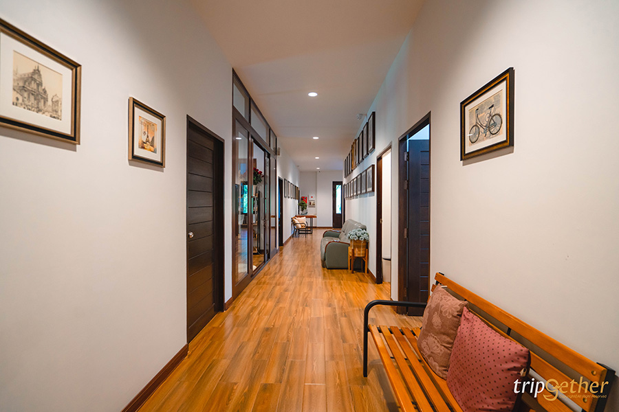 สำหรับบรรยากาศในบ้าน เริ่มตั้งแต่เปิดประตูเข้ามาจะเจอกับห้องนั่งเล่น ส่วนนี้เป็นพื้นที่ส่วนกลางที่สามารถจัดเป็นพื้นที่กิจกรรมอินดอร์ได้ บอกเลยว่าพื้นที่ตรงนี้กว้างขวางมาก และเมื่อเดินเข้าไปอีกก็จะเป็นในส่วนของห้องต่างๆ แบ่งออกเป็นห้องนอน 6 ห้องและห้องอาหาร 1 ห้อง ผู้เข้าพักสามารถเลือกจองเป็นห้องๆ โดยมีให้เลือกทั้งแบบคู่และแบบครอบครัว หรือใครอยากเหมาทั้งหลังก็สามารถรองรับกลุ่มคนได้มากสุด 44 คน