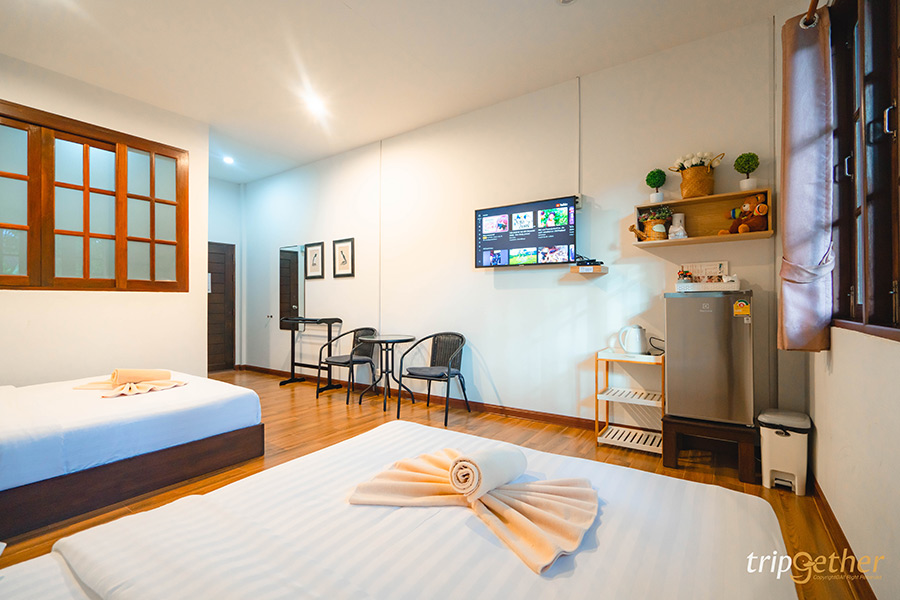 สำหรับห้องนอนมี 6 ห้อง แบ่งออกเป็นห้อง Superior Room 4 ห้องและห้อง Family Rooom 2 ห้อง มาเริ่มกันที่ห้อง Superior Room สำหรับ 3 – 4 คน ภายในห้องให้พื้นที่ใช้สอยมาค่อนข้างเยอะ พร้อมกับสิ่งอำนวยความสะดวกต่างๆ มาอย่างครบครัน ไม่ว่าจะเป็นทีวี ตู้เย็น กาน้ำร้อน แอร์ ผ้าเช็ดตัว นอกจากนี้ทุกห้องมีห้องน้ำส่วนตัวด้วย