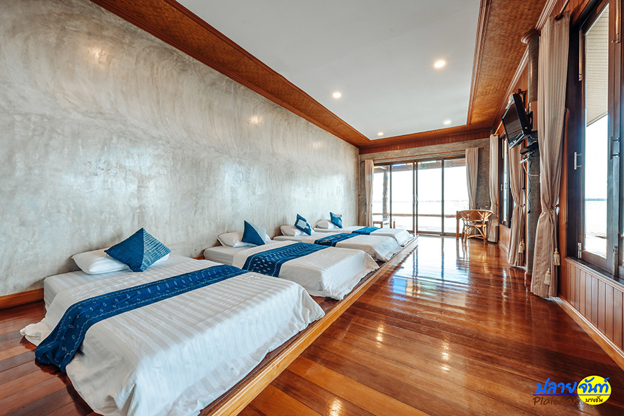 และบ้านหลังสุดท้ายเป็นสไตล์บ้านแฝด เป็นบ้านพักสองหลังติดกันสามารถพักได้หลังละ 4 คน มีระเบียงหน้าห้องพักเป็นพื้นที่เดียวกัน หันหน้ารับวิวทะเล เหมาะกับการมากันแบบยกแก๊งค์หรือครอบครัว ภายในห้องพักกว้างขวางนอนกัน 4 คนสบายๆ ไม่อึดอัดแน่นอน สิ่งอำนวยความสะดวกมีทั้งทีวี ตู้เย็น แอร์