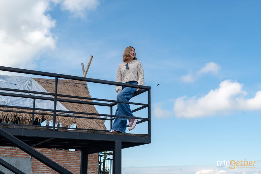 เริ่มกันที่โซนทางเข้าที่พักจะอยู่ที่บริเวณชั้นที่ 5 แบ่งพื้นที่ส่วนหนึ่งเป็นจุดชมวิวสวย ที่เป็นสะพานยื่นออกสู่ธรรมชาติ ใครที่มานอนที่นี่ต้องมีรูปมุมนี้แน่นอน บริเวณนี้นอกจากจะเป็นจุดชมวิวแล้ว ยังเป็นที่ตั้งของห้องอาหารมื้อเย็น และมุมพักผ่อนชิลล์ๆ สามารถสั่งกาแฟมานั่งดริปที่มุมนี้ได้ด้วย