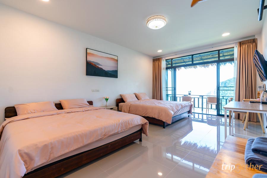 และห้องพักแบบสุดท้ายสำหรับ 4 คน ขนาดห้องพักจะใหญ่ขึ้นจากเดิม แต่การดีไซน์หรือเฟอร์นิเจอร์ภายในห้องพักจะเหมือนกันทุกห้อง สำหรับห้องนี้เหมาะสำหรับกลุ่มเพื่อน กลุ่มครอบครัว ภายในห้องพักจะมีเตียงนอนขนาด 6 ฟุต 2 เตียงด้วยกัน