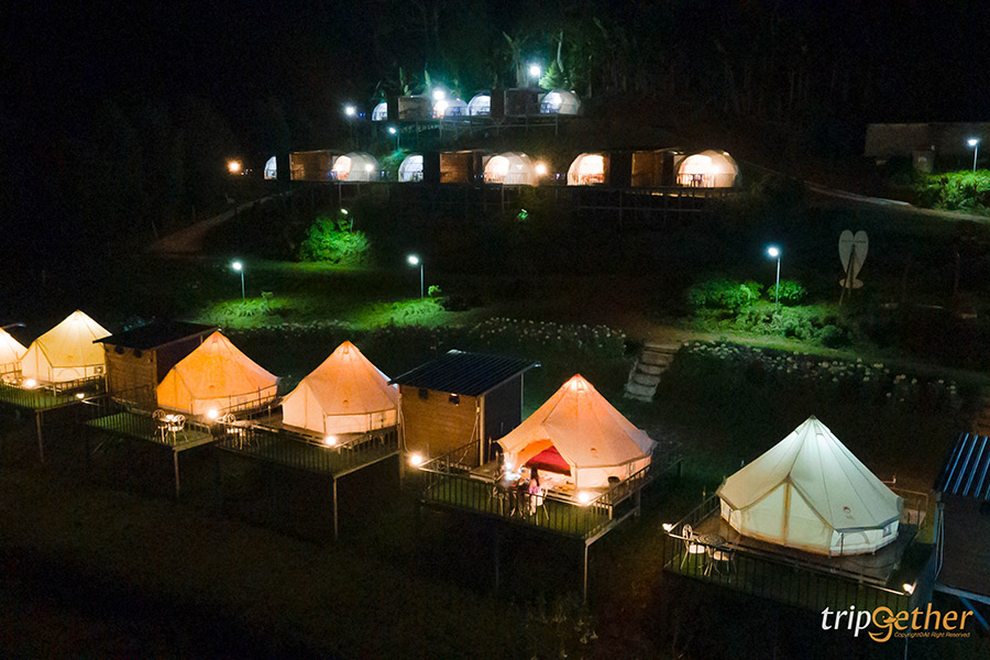 สำหรับห้องพักโซนเต็นท์มีทั้งหมด 2 โซน ได้แก่ โซนด้านบนที่เป็นเต็นท์โดมใสและโซนด้านล่างที่เป็นเต็นท์กระโจม ซึ่งการตั้งเต็นท์ก็จะอยู่บนเนินที่สูงลดหลั่นกันไป ทำให้วิวทิวทัศน์ที่ได้สวยงามต่างกันไป ไม่ว่าจะอยู่ตรงไหนก็เห็นความอุดมสมบูรณ์ของธรรมชาติแบบเต็มๆ ตา และถึงจะเป็นการนอนเต็นท์แต่ก็สบายมากๆ เพราะมีสิ่งอำนวยความสะดวกต่างๆ รวมถึงมีห้องน้ำส่วนตัวทุกหลัง ว่าแล้วก็ไปดูกันดีกว่าว่าข้างในเต็นท์แต่ละหลังจะน่าไปนอนพักขนาดไหน