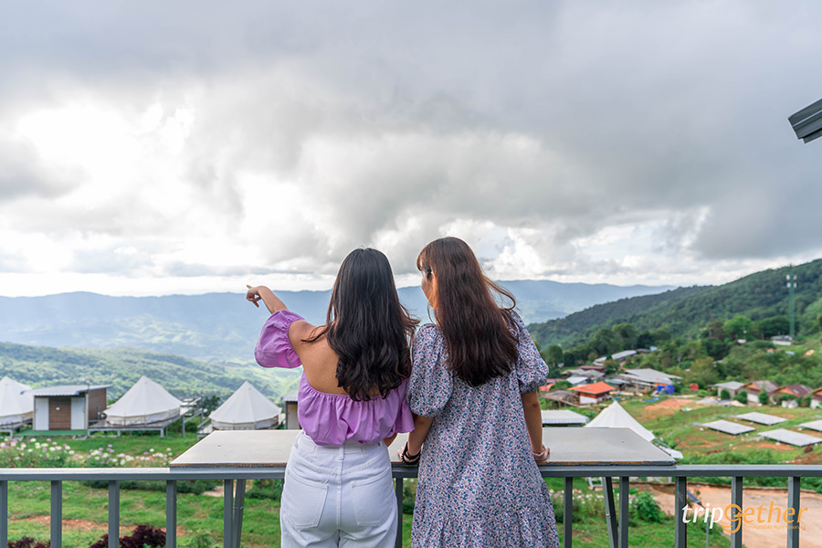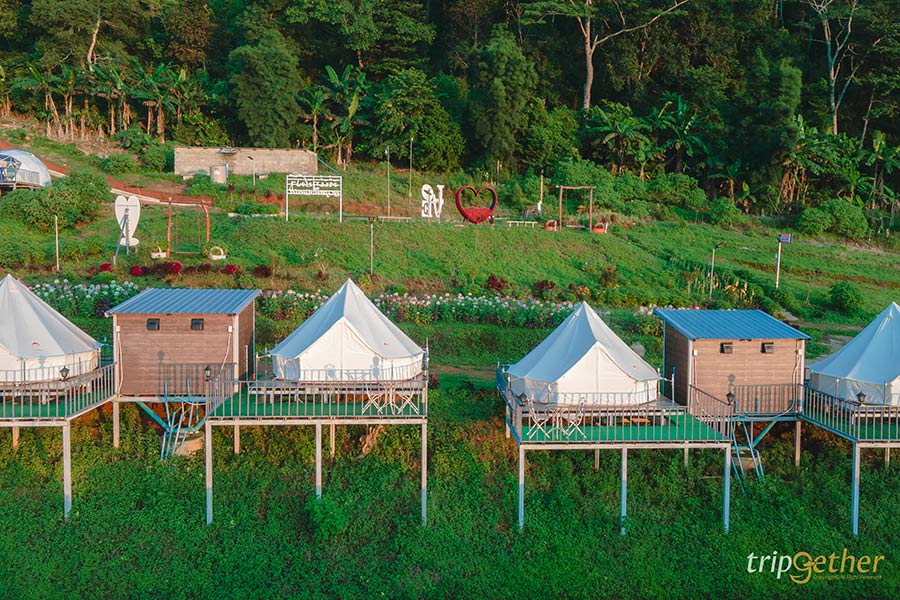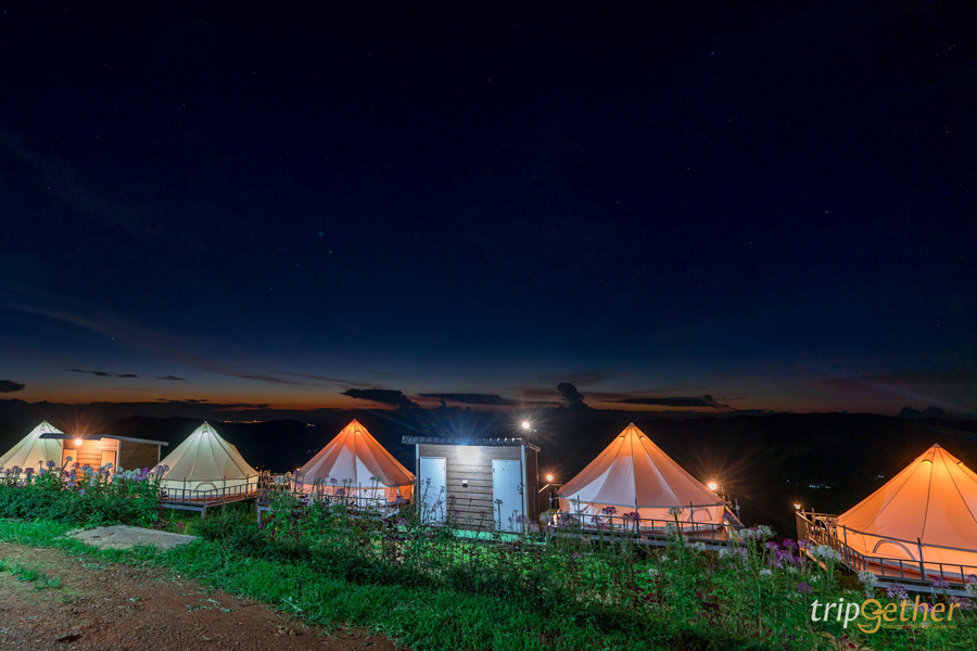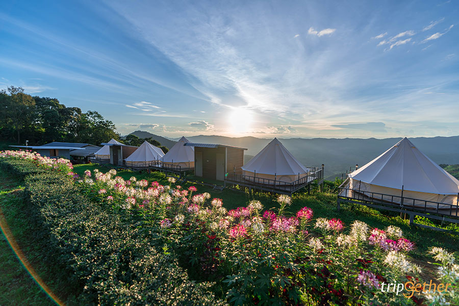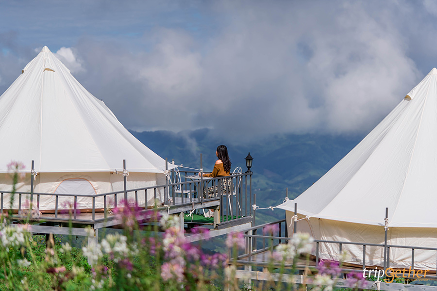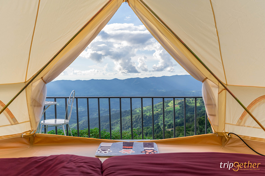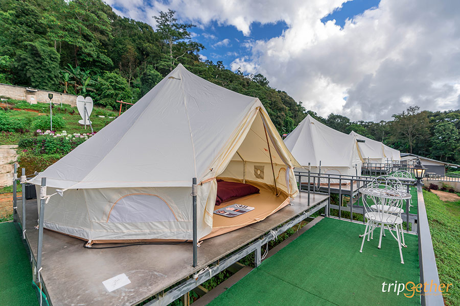มาต่อกันที่ เต็นท์กระโจม ตั้งอยู่ที่เนินส่วนล่างและมีทั้งหมด 10 หลัง โซนนี้ให้ฟีลแคมป์ปิ้งกลางธรรมชาติมาก บริเวณหน้าเต็นท์มีระเบียงที่ปูด้วยหญ้าเทียม พร้อมโต๊ะและเก้าอี้ให้ได้นั่งเสพธรรมชาติชิลล์ๆ บวกกับภาพเบื้องหน้าเป็นวิวทิวเขาสลับซับซ้อนกับโทนสีเขียวของต้นไม้ใบหญ้าที่ไล่เฉดกัน เป็นภาพที่สวยงามและดูสบายตามากๆ ส่วนภายในเต็นท์มีฟูก 2 หลัง และมีพื้นที่ใช้สอยเพียงพอสำหรับ 2 – 3 คน รวมถึงสิ่งอำนวยความสะดวกต่างๆ อย่างชุดเครื่องนอน น้ำดื่ม ผ้าเช็ดตัว ทางที่พักก็เตรียมไว้ให้พร้อม ในส่วนของเครื่องปรับอากาศหรือพัดลมทางที่พักอาจจะไม่ได้มีให้ แต่บอกเลยว่าไม่จำเป็นเพราะอากาศที่นี่พอตกกลางคืนหนาวมาก ไม่ว่าจะมาฤดูไหนก็ไม่ต้องกลัวร้อนเลย