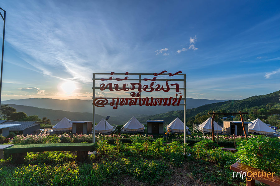 ภูทองแคมป์ ที่พักภูชี้ฟ้าสไตล์แคมป์ปิ้งที่โอบล้อมไปด้วยธรรมชาติ โลเคชั่นก็ดีมากๆ เพราะตัวที่พักตั้งอยู่บนเนินเขาสูง ทำให้สามารถมองเห็นความเขียวชอุ่มของหุบเขาและเนินเขาน้อยใหญ่ที่ขึ้นสลับซับซ้อนแบบพาโนรามา แถมยังเหมือนได้อยู่ใกล้ชิดกับท้องฟ้า สามารถเห็นความสวยงามของท้องฟ้าในช่วงเวลาต่างๆ ไม่ว่าจะเป็นฟ้าสีส้มๆ ยามพระอาทิตย์ตกดิน หรือจะฟ้าที่เต็มไปด้วยแสงดาวในยามค่ำคืน เรียกได้ว่าดื่มด่ำกับธรรมชาติกันแบบเต็มๆ อีกทั้งที่พักยังมีอากาศเย็นสบายตลอดทั้งปี โดยด้านหลังที่พักปกคลุมไปด้วยต้นไม้ใหญ่จำนวนมาก ส่วนด้านหน้าเป็นหุบเขาโล่งๆ มีลมค่อยพัดโกรกตลอด ใครอยากมาสัมผัสบรรยากาศดีๆ แบบนี้ห้ามพลาดมานอนเต็นท์ที่ภูทองแคมป์สักคืน