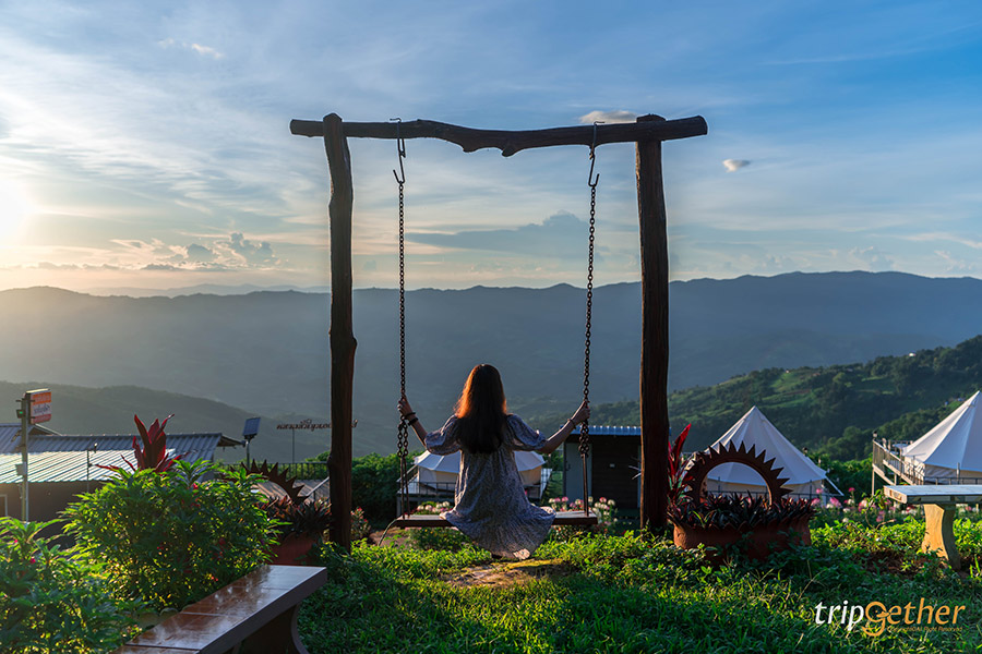 ถ่ายรูปตรงมุมชิงช้าคือปังมาก ฉากหลังเป็นภูเขาลูกใหญ่ที่ทอดยาวตลอดแนว แสดงให้เห็นถึงความยิ่งใหญ่ของธรรมชาติมาก