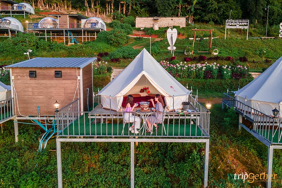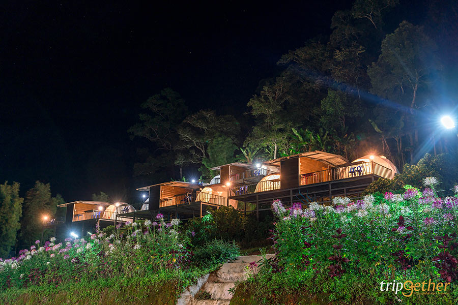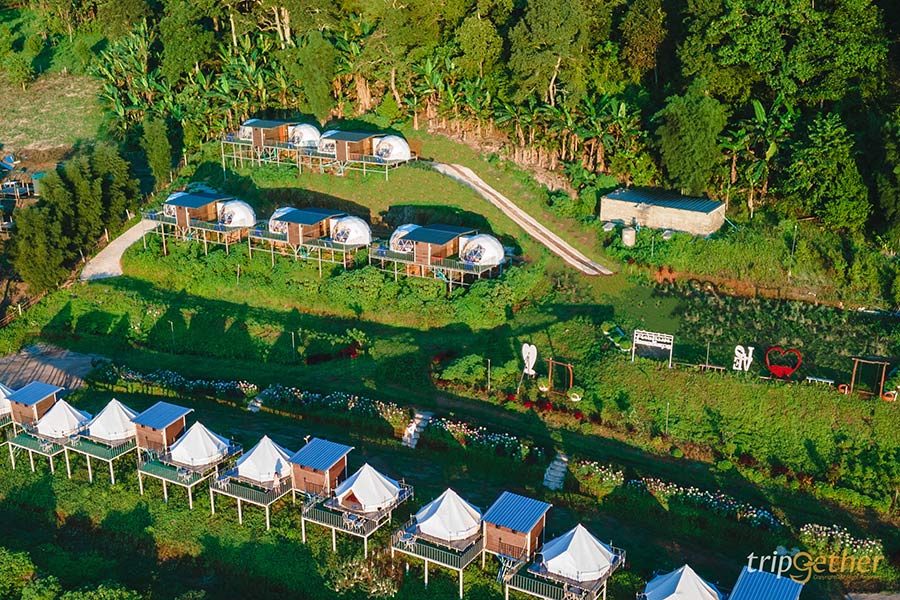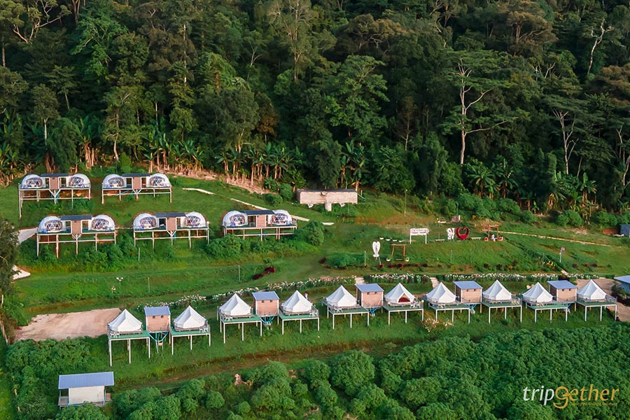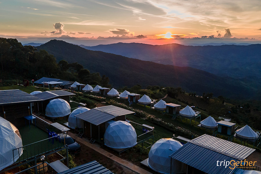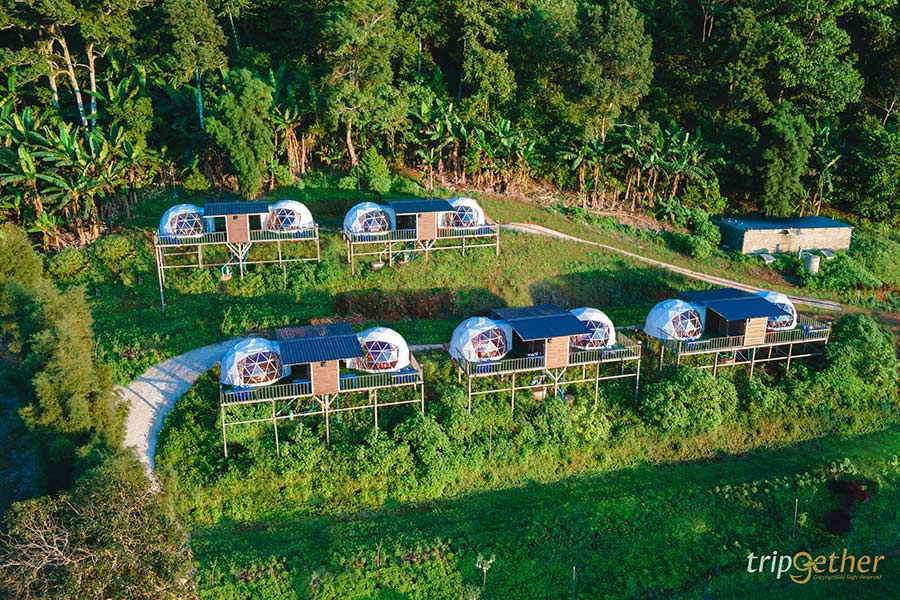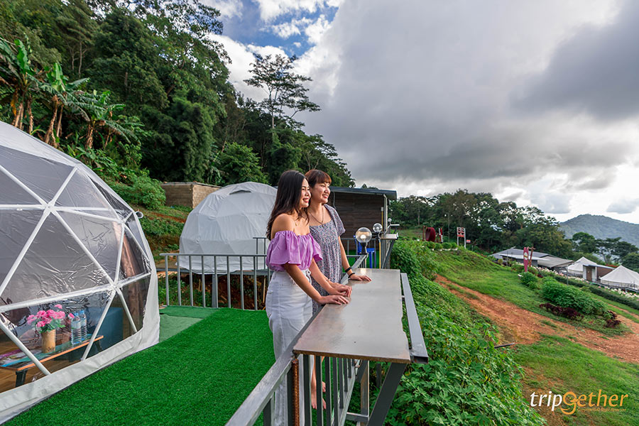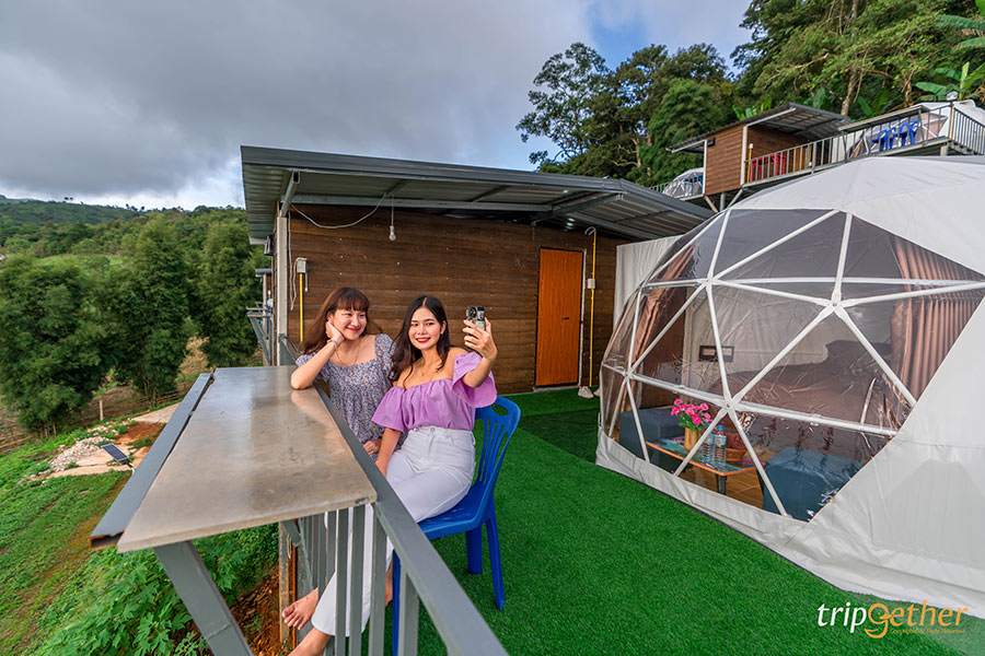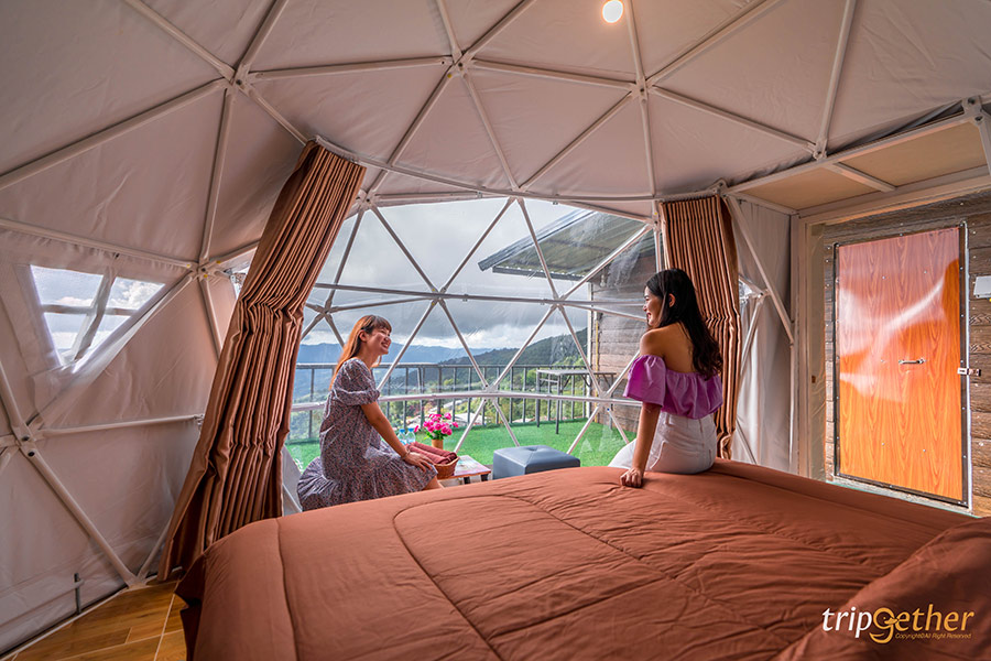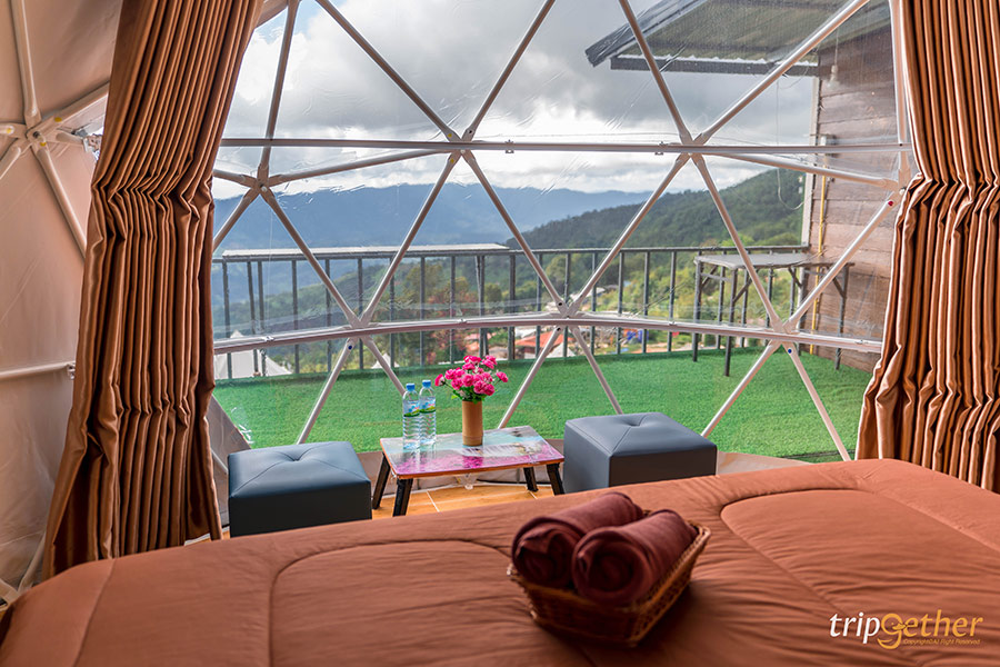 มาเริ่มต้นกันด้วย เต็นท์โดมใส ตั้งอยู่บนเนินที่สูงสุดของที่พักและมีด้วยกัน 10 หลัง จากมุมเต็นท์โดมใสนอกจากจะได้ภาพหุบเขาและทิวเขารายล้อมแล้วยังได้เห็นวิวทิวทัศน์แบบกว้างๆ ภายในที่พักอีกด้วย อีกทั้งเต็นท์โดมใสทุกหลังจะมีระเบียงให้ได้ออกไปนั่งชิลล์ ดื่มด่ำกับบรรยากาศเย็นสบาย ถ้าอากาศหนาวๆ ก็เดินเข้ามาในเต็นท์ ภายในมีพื้นที่ใช้สอยพอสมควร สามารถนอนพัก 2 คนได้อย่างสบาย มีเตียงนอนหลังใหญ่และชุดเครื่องนอนครบครัน เหมาะกับการนอนพักผ่อนสบายๆ ขณะเดียวกันก็มองดูบรรยากาศนอกเต็นท์ผ่านหน้าต่างใส บอกเลยว่าฟีลดีมากๆ
