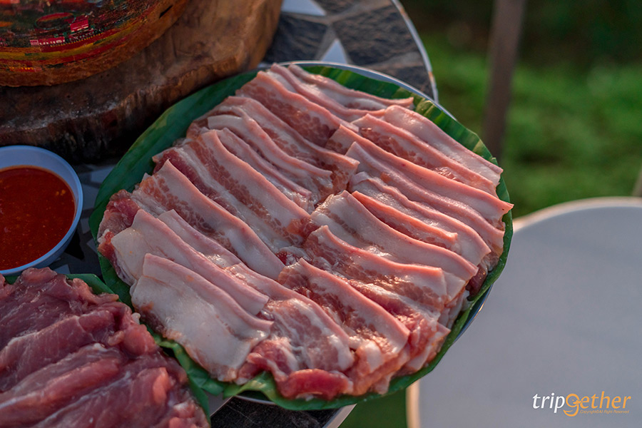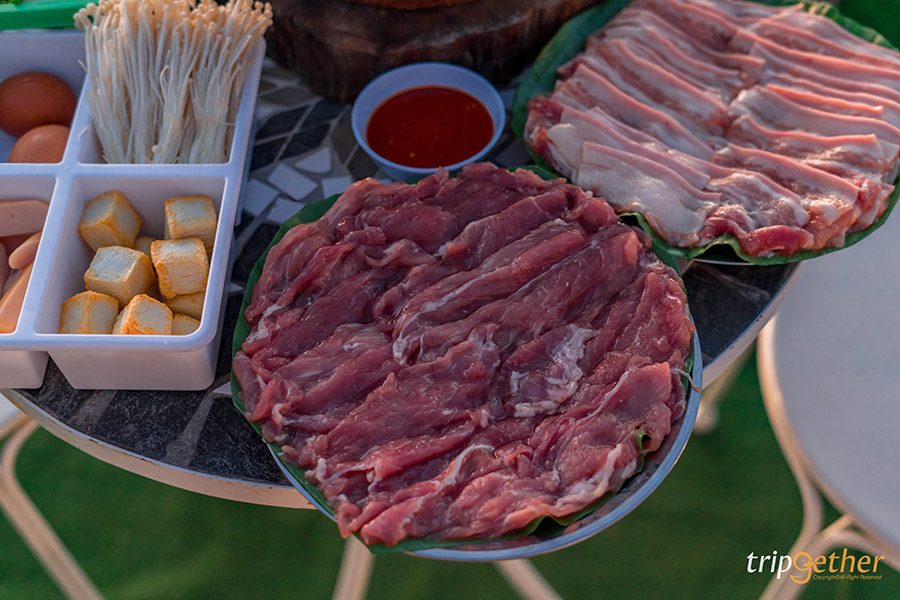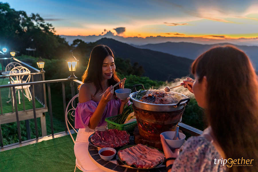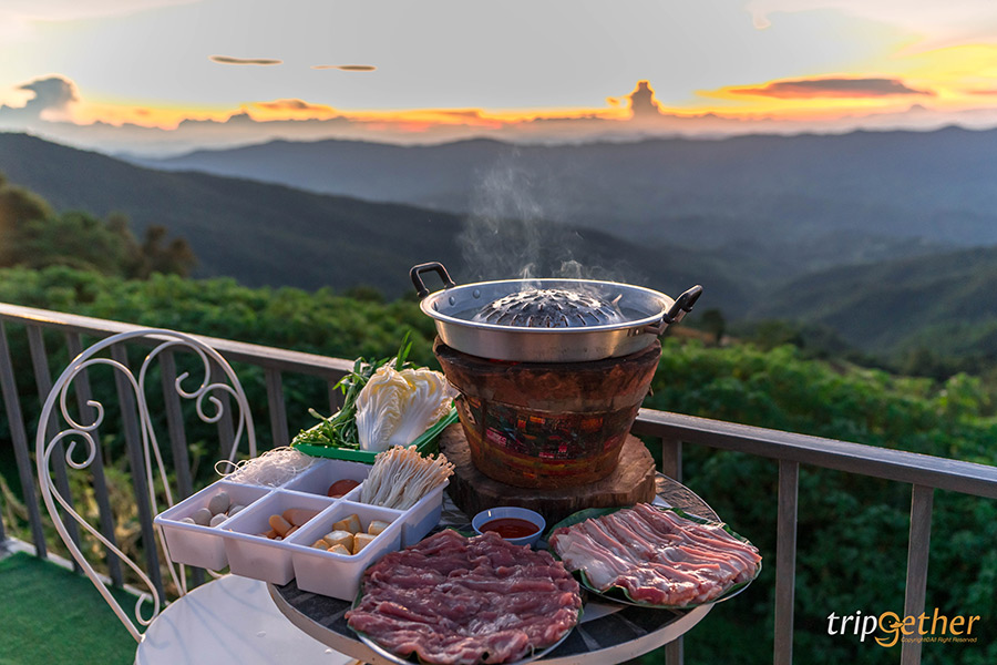เดินเล่นชิลล์ๆ ถ่ายรูปกันเพลินๆ พระอาทิตย์ก็เริ่มตกดินแล้ว ได้เวลาของมื้อเย็น และแน่นอนว่าเมนูยอดฮิตเวลามาเที่ยวบนดอยก็คือ หมูกระทะ สามารถสั่งมากินฟินๆ ได้ที่หน้าห้องพักเลย โดยหมูกระทะจัดเต็มแบบจุกๆ ทั้งเนื้อหมู เบคอน ลูกชิ้น ไส้กรอก เต้าหู้ปลา และเซ็ตผักต่างๆ บอกเลยว่าปริมาณที่เสิร์ฟให้คือเยอะมาก กินได้ 3 – 4 คนเลย หมูกระทะจัดเต็มแบบนี้ราคาเพียง 499 บาทเท่านั้น คุ้มกว่านี้ไม่มีอีกแล้ว หรือถ้าใครอยากกินง่ายๆ หน่อยก็สามารถสั่งอาหารตามสั่งมากินได้เหมือนกัน