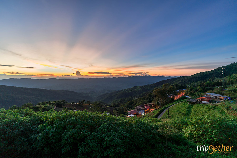 จากบริเวณที่พักสามารถเห็นพระอาทิตย์ค่อยๆ ตกหลังขุนเขา แสงสวยและฟีลดีมาก