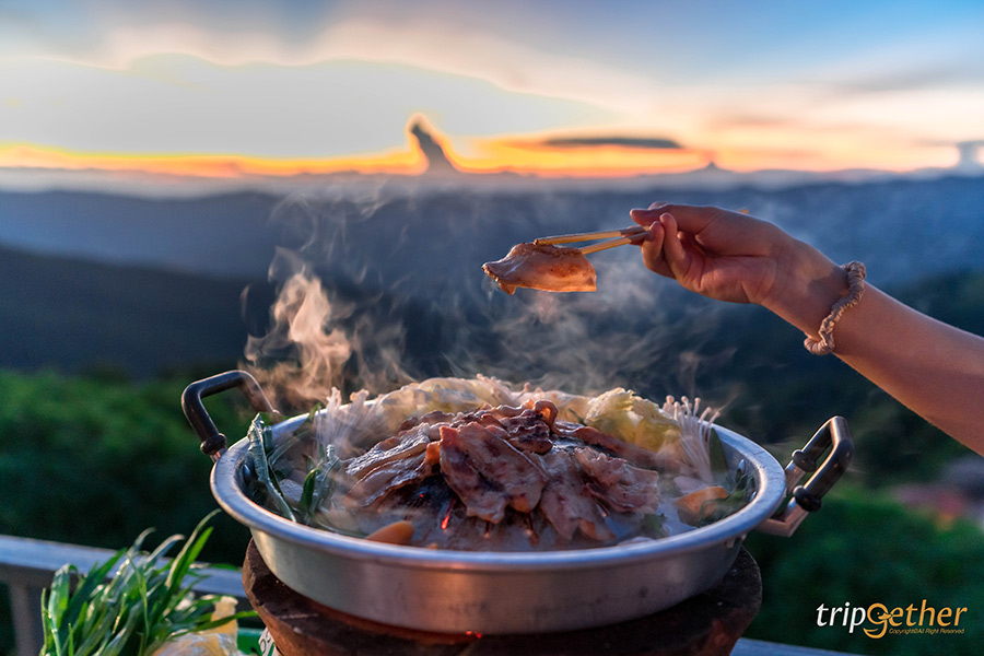 กินปิ้งย่างร้อนๆ จิ้มน้ำจิ้มแซ่บๆ กลางอากาศเย็นสบาย มีแสงอาทิตย์ตกดินและวิวภูเขาเป็นฉากหลัง ความฟินเอาไปเต็มร้อยเลย