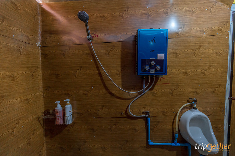 ห้องน้ำแยกตัวออกมาจากเต็นท์ แต่อยู่ในพื้นที่เดียวกัน เรียกได้ว่าเปิดประตูเต็นท์ออกมาก็เดินเข้าห้องน้ำได้เลย ภายในห้องน้ำถือว่ามีพื้นที่ค่อนข้างกว้างเลย มีอุปกรณ์อาบน้ำทั้งสบู่และแชมพู แถมใครกลัวอากาศหนาวก็มีเครื่องทำน้ำอุ่นด้วย