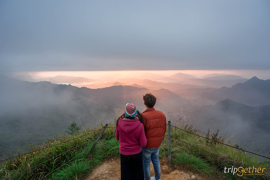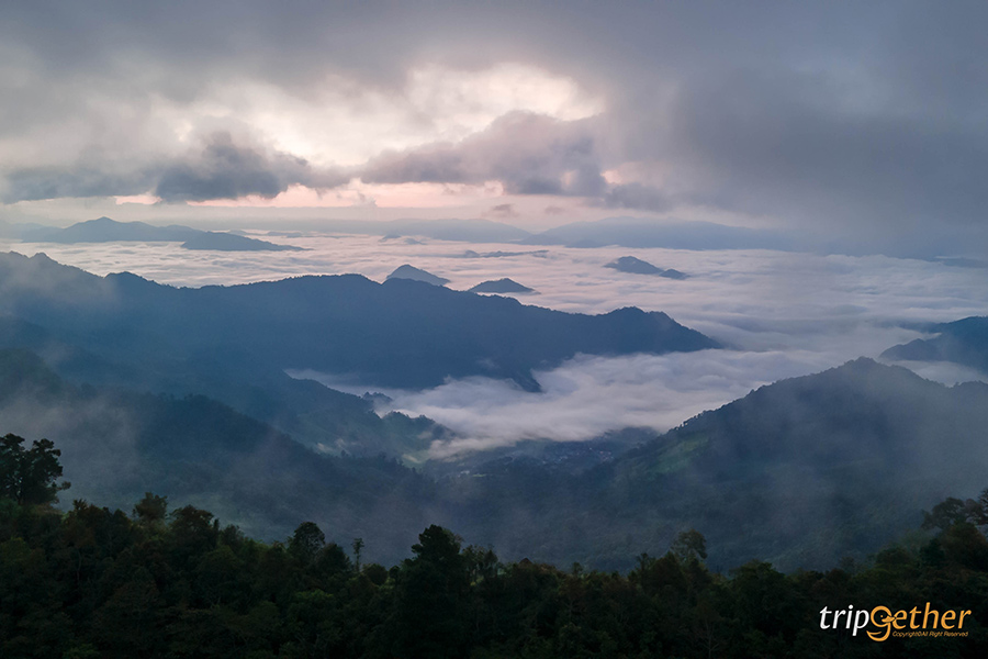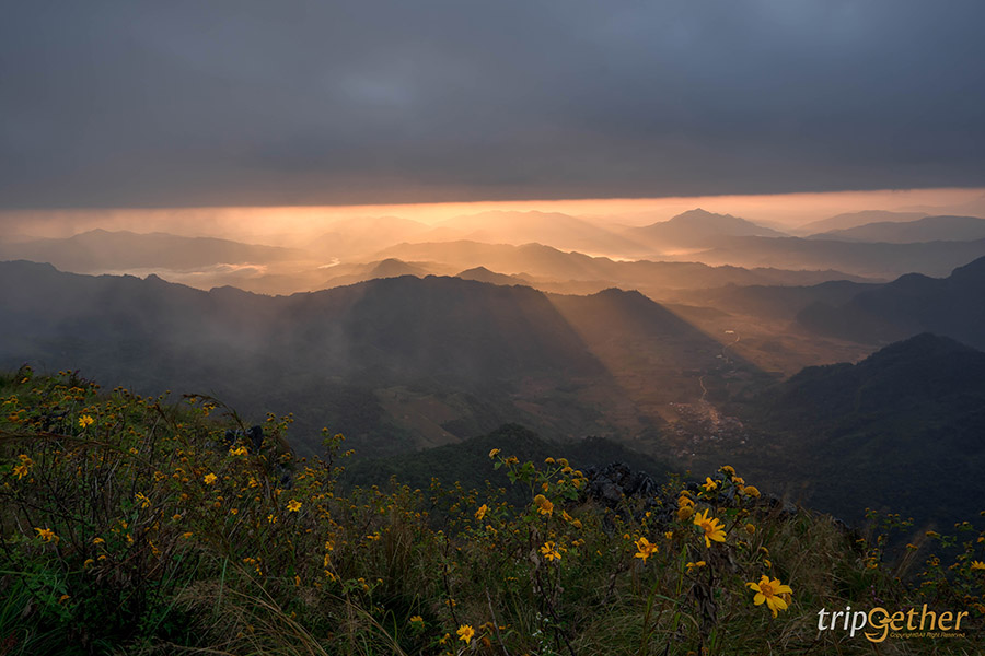 ภาพแสงอาทิตย์ที่กำลังส่องผ่านเมฆหมอก มีภูเขาสลับซับซ้อนเป็นเงา สวยงามจนแทบอยากอยู่บนนี้นานๆ