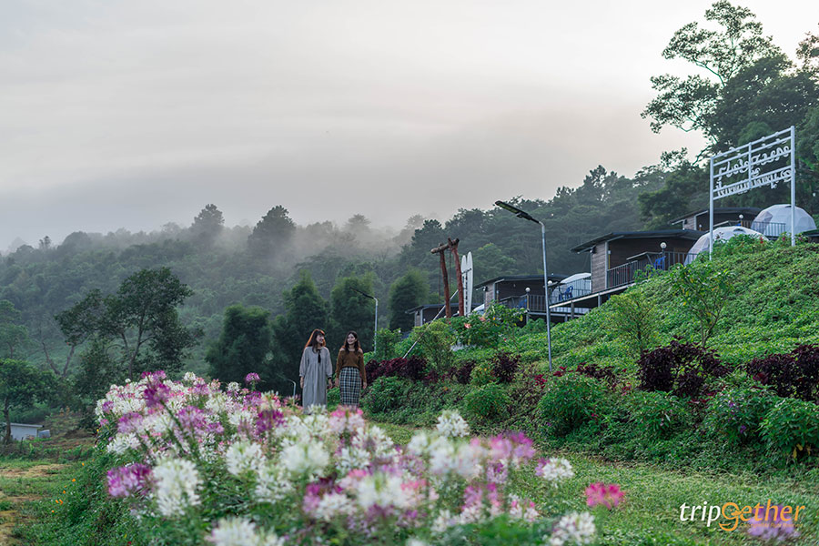 มาถึงช่วงเช้าที่บรรยากาศหมอกปกคลุมรอบที่พัก แค่เปิดประตูออกมาหน้าเต็นท์ก็สัมผัสได้ถึงความเย็น ได้สูดอากาศบริสุทธิ์เต็มๆ ปอด และเมื่อเดินไปสนามหญ้าจะเห็นน้ำค้างเกาะอยู่ตามดอกไม้ใบหญ้า ดูชุ่มฉ่ำและสดชื่นมากๆ อีกทั้งเดินเล่นชิลล์ๆ ก็มีสายหมอกคลอเคลียอยู่รอบๆ ตัวเรา บอกเลยว่าคุ้มค่ากับการตื่นเช้ามาก