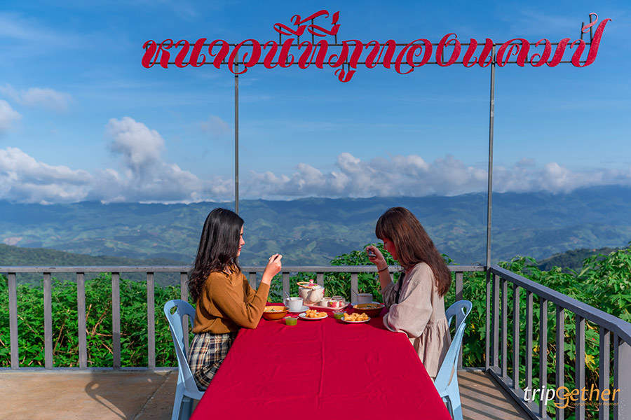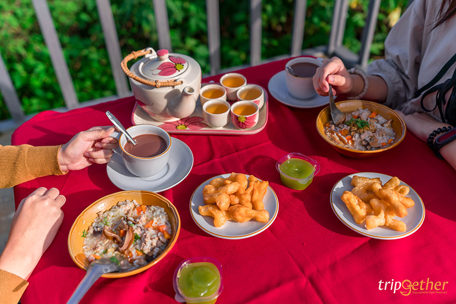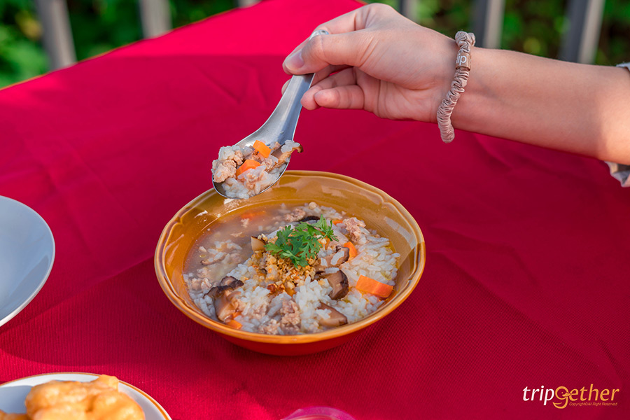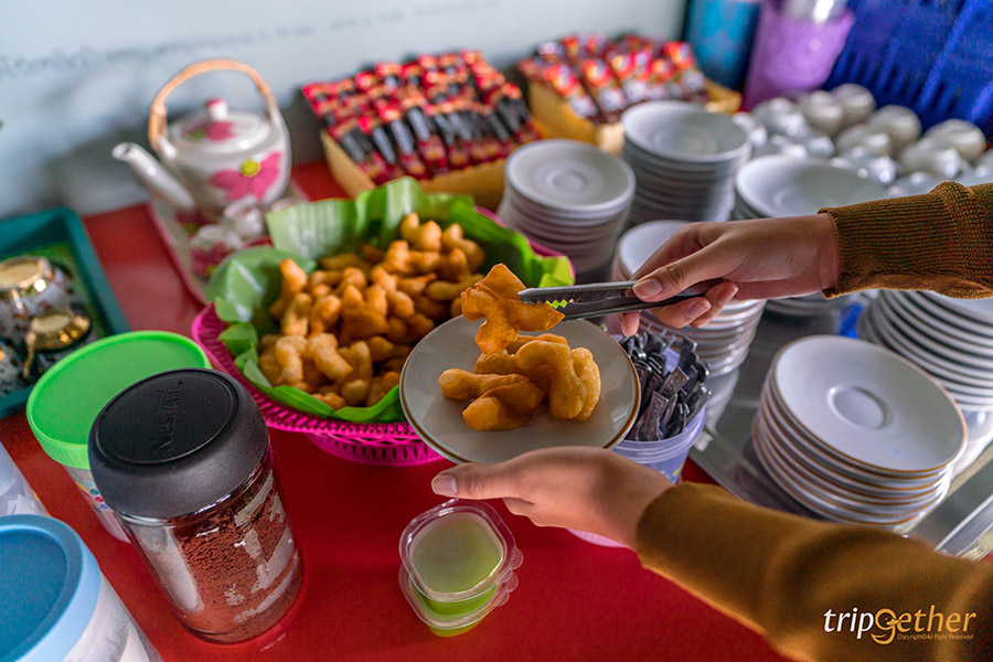 ท่ามกลางอากาศหนาวๆ มาอุ่นท้องร้อนๆ ในยามเช้ากันด้วยมื้อเช้าอย่าง ข้าวต้มทรงเครื่อง ซดน้ำซุปร้อนๆ ตอนเช้าคือดีมาก นอกจากนี้ยังมีปาท่องโก๋กรอบๆ ชิ้นพอดีคำจิ้มคู่กับสังขยาใบเตยก็เข้ากันสุดๆ อีกทั้งยังมีกาแฟ โอวัลติน และชาร้อนให้ได้นั่งจิบชิลล์ๆ ใช้เวลาช่วงเช้าอย่างช้าๆ มองวิวความเขียวชอุ่มของหุบเขา เรียกได้ว่าเป็นการเริ่มต้นวันที่ดีงามและเหมือนได้ชาร์จพลังให้พร้อมกับการเดินทางมากๆ