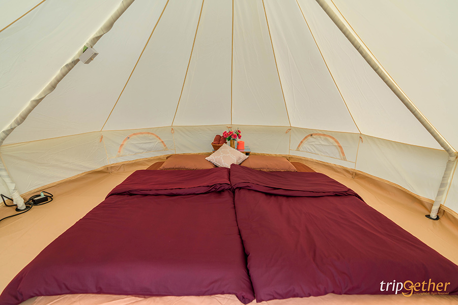 บรรยากาศในเต็นท์กระโจมไม่ได้ดูอึดอัดเลย ตัวกระโจมสูงพอสมควร ยิ่งถ้าเปิดหน้าเต็นท์กว้างๆ ช่วยให้เต็นท์ดูโล่งโปร่ง