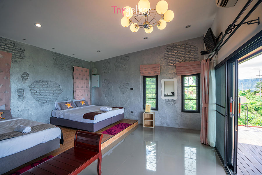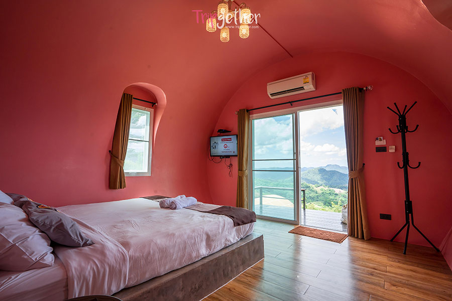ห้องแยมโรล 3 ภายในห้องพักมีเตียงคิงไซส์หนานุ่ม ให้คุณนอนมองวิวทิวเขาสีเขียวตัดกับท้องฟ้าสดใส และในตอนเช้าๆ ก็ได้นอนชมทะเลหมอกฟุ้งสีขาวจากปลายเตียงกันแบบฟินๆ