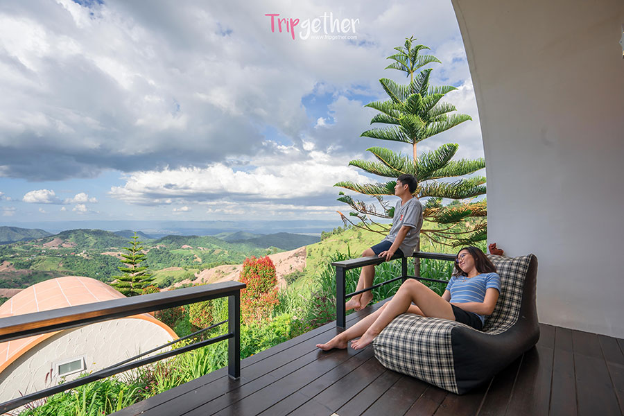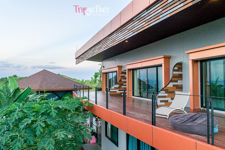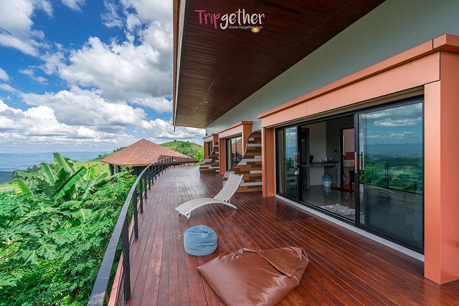 มีระเบียงหน้าห้องกว้างๆ พร้อมเดย์เบดและเบาะบีนแบคไว้ให้นอนรับลมชมวิวธรรมชาติกันแบบพาโนรามา