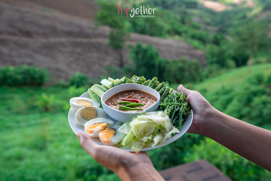 ปิดท้ายด้วย ชุดน้ำพริกกะปิ+ผักลวก เมนูพิเศษสุดจากภูแสนดาวที่ได้รสชาติน้ำพริกกะปิเต็มคำทานคู่กับผักลวก ในราคาชุดละ 100 บาท