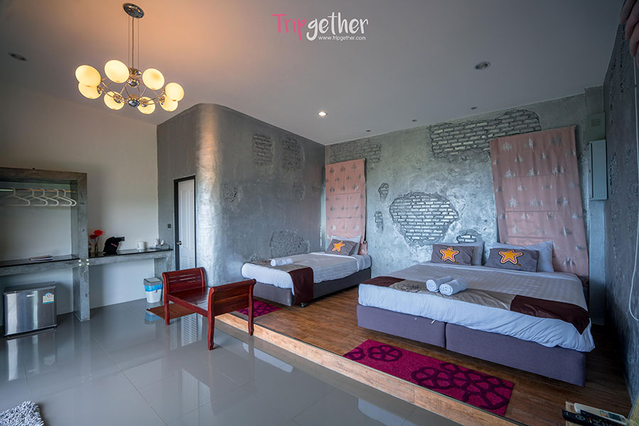 มาเริ่มกันที่โซนแรกห้องพักบริเวณด้านบนสุดของรีสอร์ทตกแต่งสไตล์โมเดิร์น มีด้วยกัน 3 ห้อง 3 สี อย่างห้อง Blue Yellow และ Silver ความโดดเด่นของห้องพักโซนนี้นอกจากจะตั้งอยู่บนโลเคชั่นที่มองเห็นวิวได้ทั่วทุกพิ้นที่ของรีสอร์ทแล้ว ยังสามารถพักได้ 3-4 คน สามารถมาพักกันแบบครอบครัวใหญ่ได้ เพราะมีห้องพักติดกัน 3 ห้อง มีระเบียงกว้างเชื่อมถึงกัน