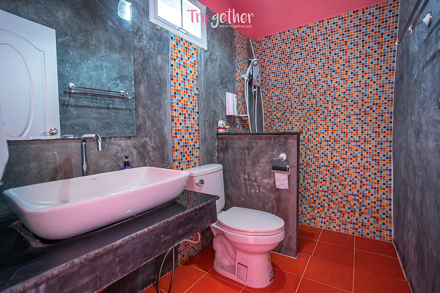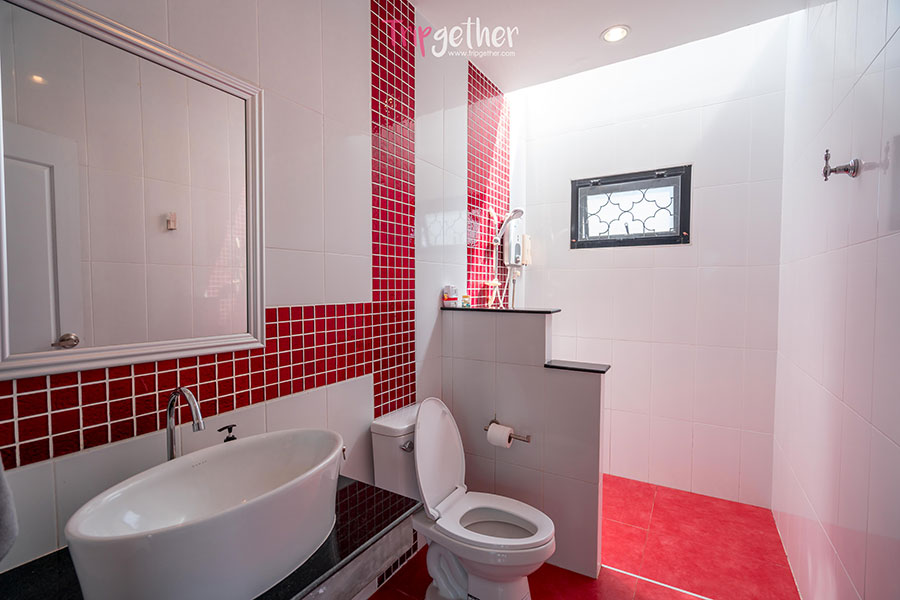 ในส่วนของห้องน้ำตกแต่งด้วยสีแดงสดตัดกับสีขาว ให้ความรู้สึกเรียบหรูดูแพงดีทีเดียว