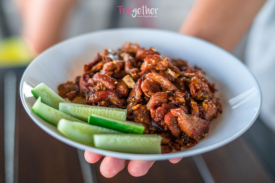 ตามมาด้วย หมูกระเทียม รสชาติเข้าเนื้อเข้มข้นกลมกล่อมหอมกระเทียม 95 บาท