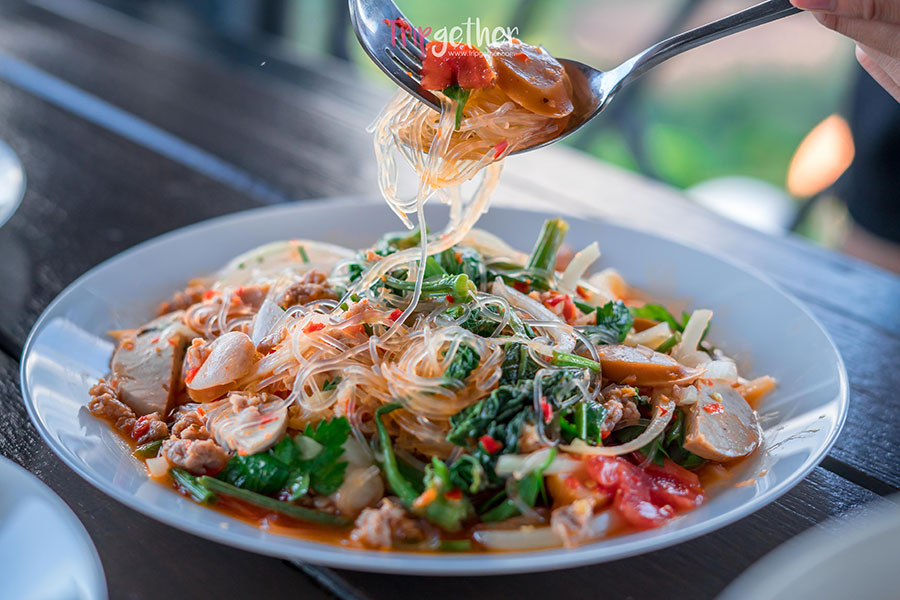 เริ่มด้วยเมนูทานเล่นง่ายๆ อย่าง ยำวุ้นเส้นหมูสับ รสชาติเผ็ดเปรี้ยวหวานลงตัว เพียง 90 บาท