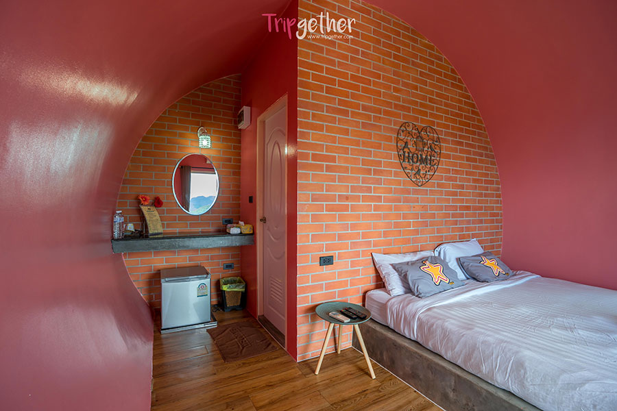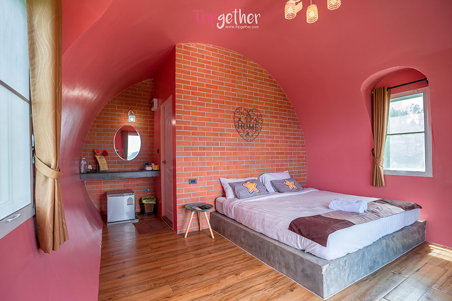 ห้องแยมโรล 5 ภายในห้องเป็นสีแดงสดใส เหมาะกับคู่รักที่มาฮันนีมูน ให้ความรู้สึกโรแมนติกมากๆ