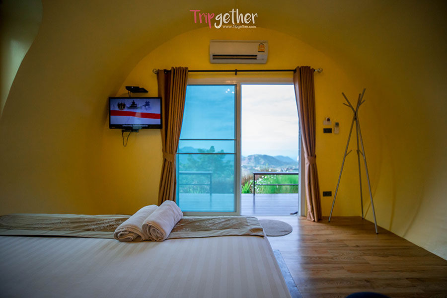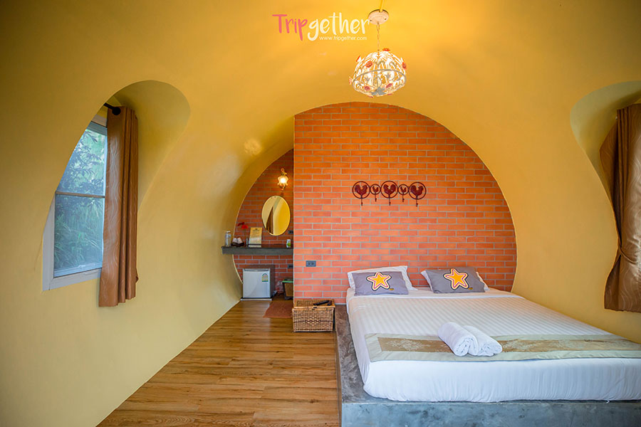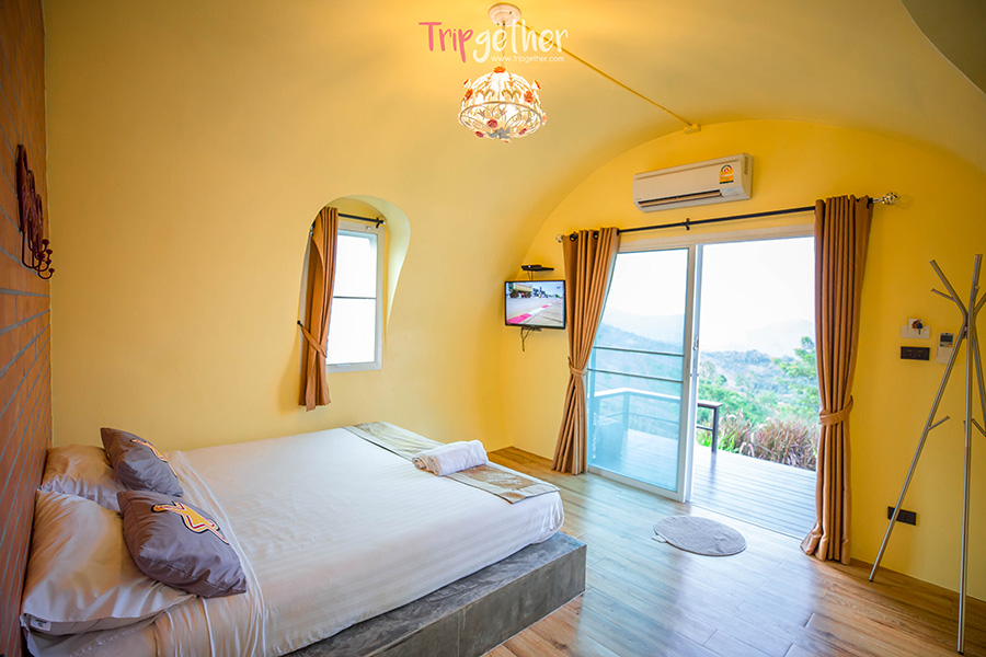 ห้องแยมโรล 4 ภายในห้องพักก็ตกแต่งได้อย่างน่ารัก มาในโทนสีเหลือนวลสบายตา มีเตียงขนาดใหญ่หันหน้าไปยังทิศตะวันตก ชมพระอาทิตย์ตกสุดโรแมนติก