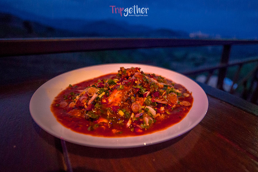 ปิดท้ายด้วยเมนูเด็ดรสชาติเข้มข้นกับ ยำไข่ดาว ไข่ดาวทอดกรอบคลุกเคล้าเข้ากับเครื่องยำ รสชาติฟินเข้ากับบรรยากาศยามเย็นในราคา 95 บาท