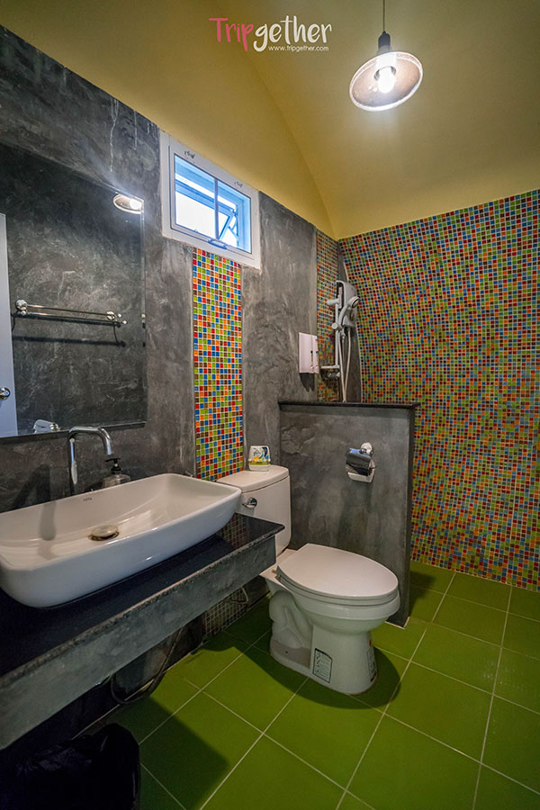 โซนห้องน้ำก็ดีไซน์น่ารักด้วยกระเบื้องสีสันสดใส แฝงกลิ่นอายลอฟท์เท่ๆ ดูดีไม่เบา