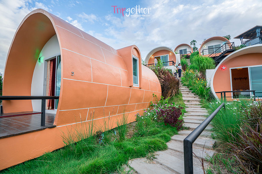 เดินมาเรื่อยๆ จะพบกันห้องพักดีไซน์แปลกตาทรงกระบอกคล้ายแยมโรล ขนาดกระทัดรัด ตกแต่งลวดลายคล้ายอิฐ มีทั้งสีขาวและสีน้ำตาล