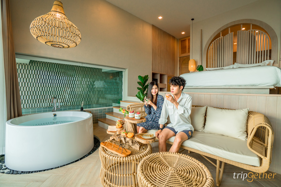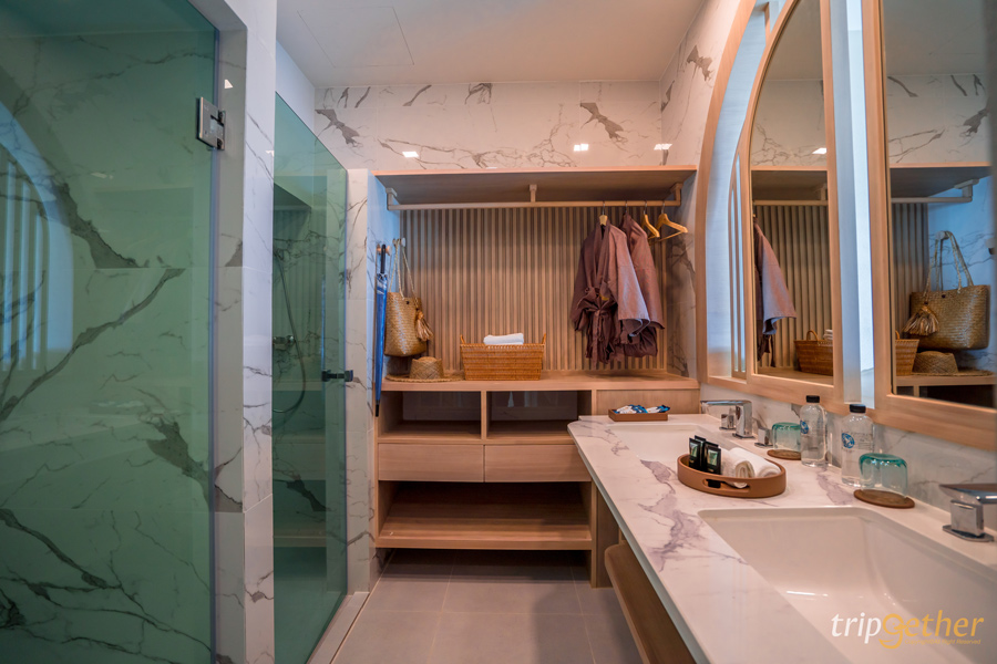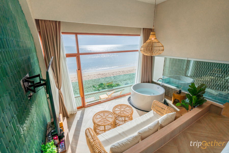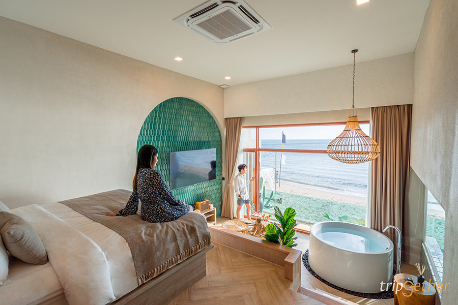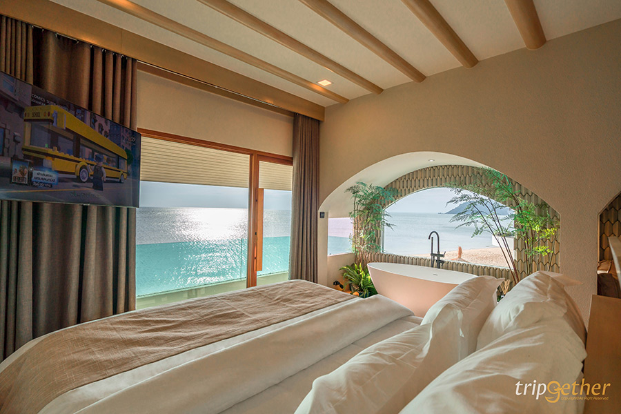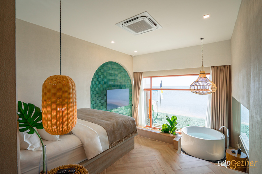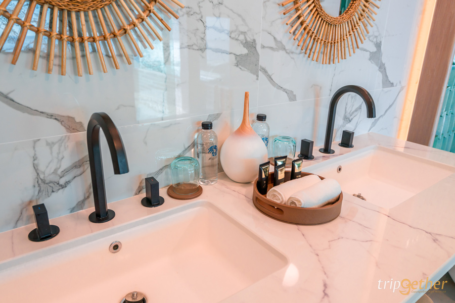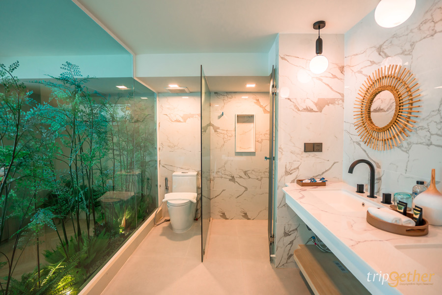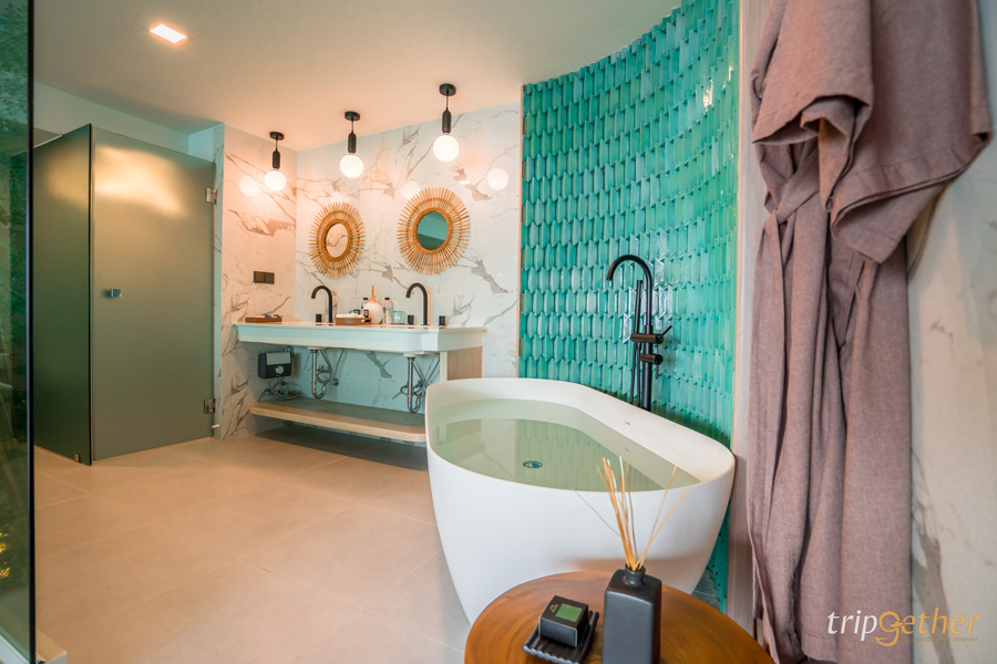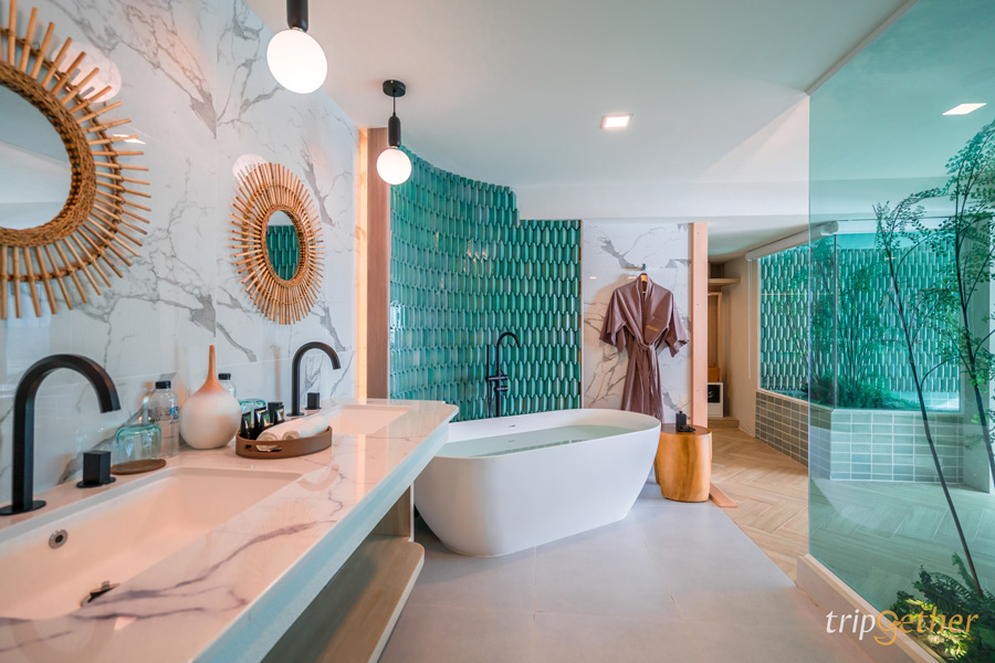ห้อง Beachfront Paradise Suite มีอ่างอาบน้ำเช่นเดียวกัน แต่จะตั้งอยู่ภายในห้องน้ำ ด้านหลังมีฉากสีเขียวสบายตา เป็นมุมถ่ายรูปเก๋ๆ ได้อีกมุมหนึ่งเลย